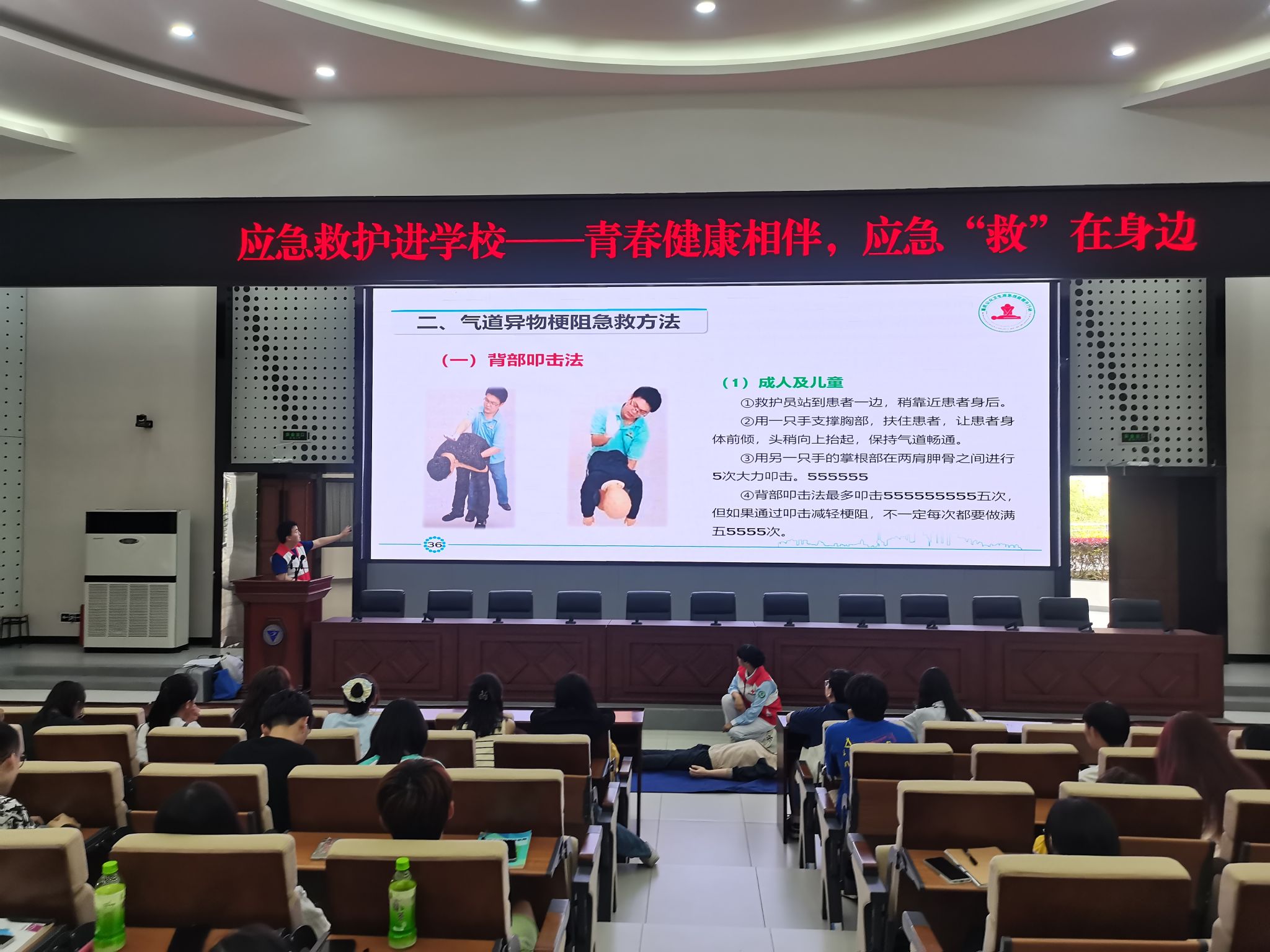 医生围绕现场急救的“黄金4分钟”,深入浅出地向现场师生讲解了现场心肺复苏技术、海姆立克急救法。