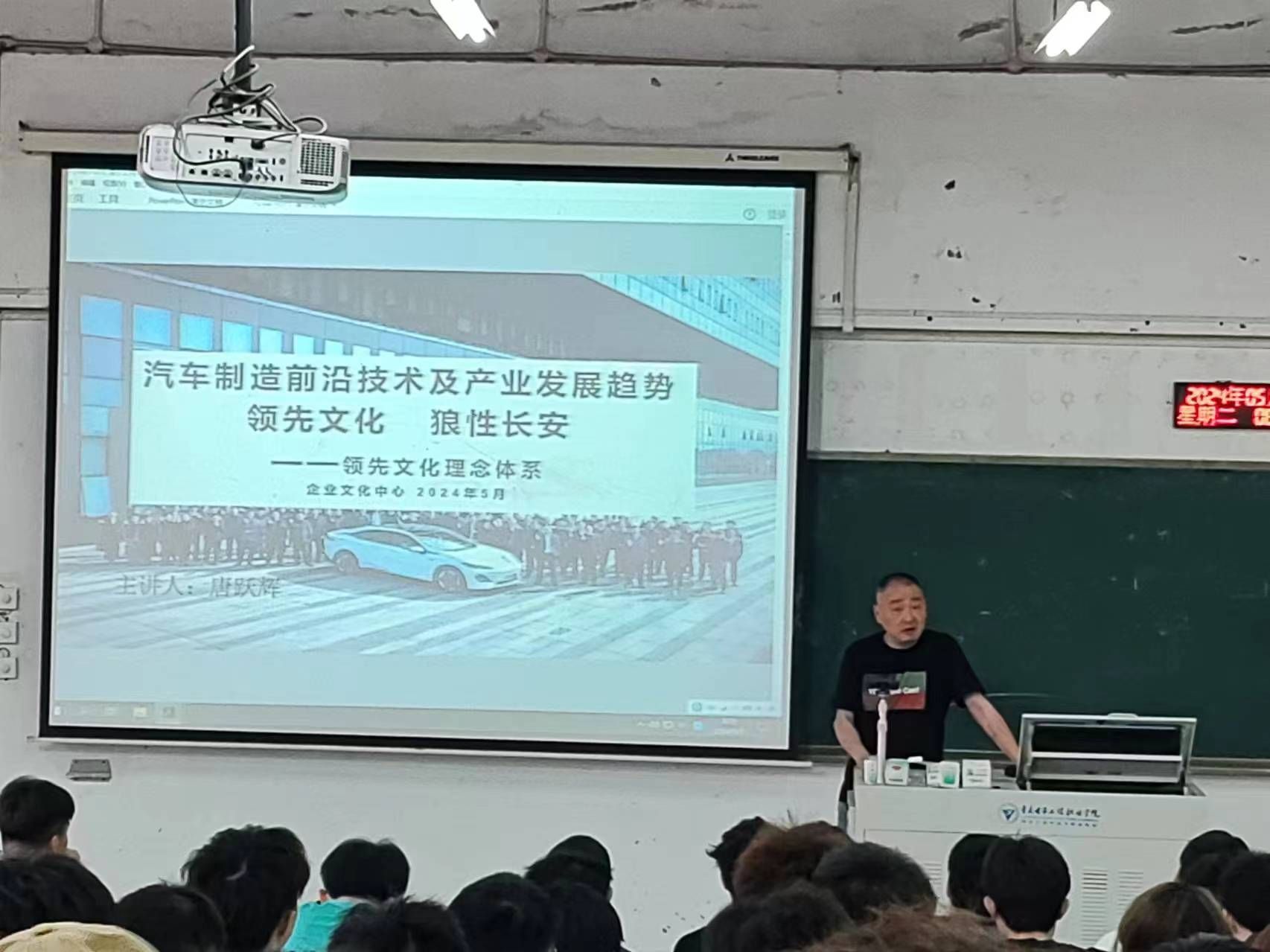 重庆长安新能源汽车科技有限公司汽车性能试验工、深蓝汽车科技有限公司首席技能大师唐跃辉,为22级汽车制造专业和23级汽车智能、新能源、汽车制造类等7个班的学生分享了汽车制造前沿技术及产业发展趋势、领先文化理念以及狼性长安文化。
