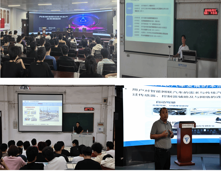 汽车维修高级技师、巴渝特级技师、重庆英才技术技能领军人才张斌为22级汽车制造、汽车智能、新能源三个专业的6个班级的学生分享了汽车行业未来的发展趋势:在自动驾驶、车联网、人工智能等方面的智能化;在节能减排、混合动力、纯电动、氢燃料等方面的电动化。