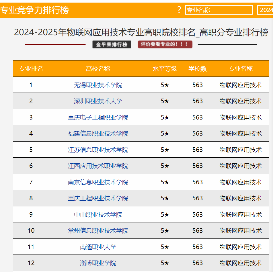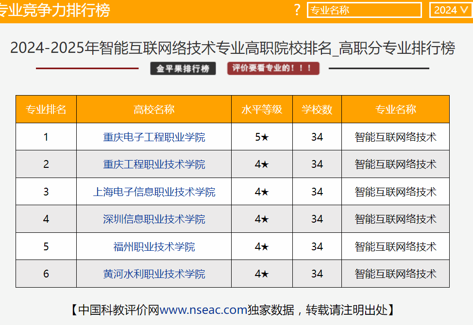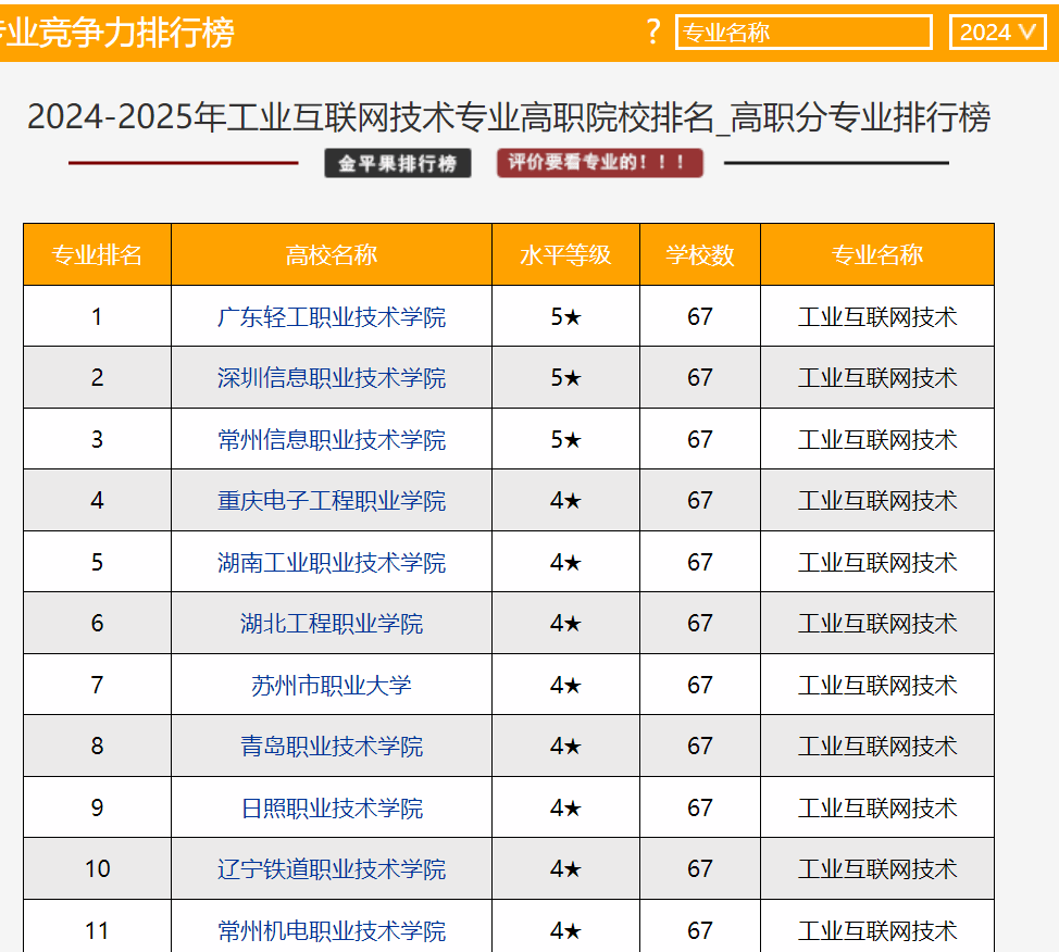 近期“金平果”发布2024年高职专业群综合竞争力评价数据,同时发布高职专业排行榜,评价对象包括全国1543所高职高专院校19个专业大类、97个专业类、738个专业、246个全国高水平专业群、1064个群内专业和33所职业本科院校的162个本科专业,对全国各地区、各类型、各高职院校的专业总体实力进行了评价分析,高职教育评价继续向深层次、多维度的专业领域评价、专业群综合竞争力评价扩展。pg国际物联网专业群各专业均排名前列,其中物联网应用技术专业排名第3,智能互联网络技术专业排名第1,电子信息工程技术专业排名第2,工业互联网技术专业排名第4。