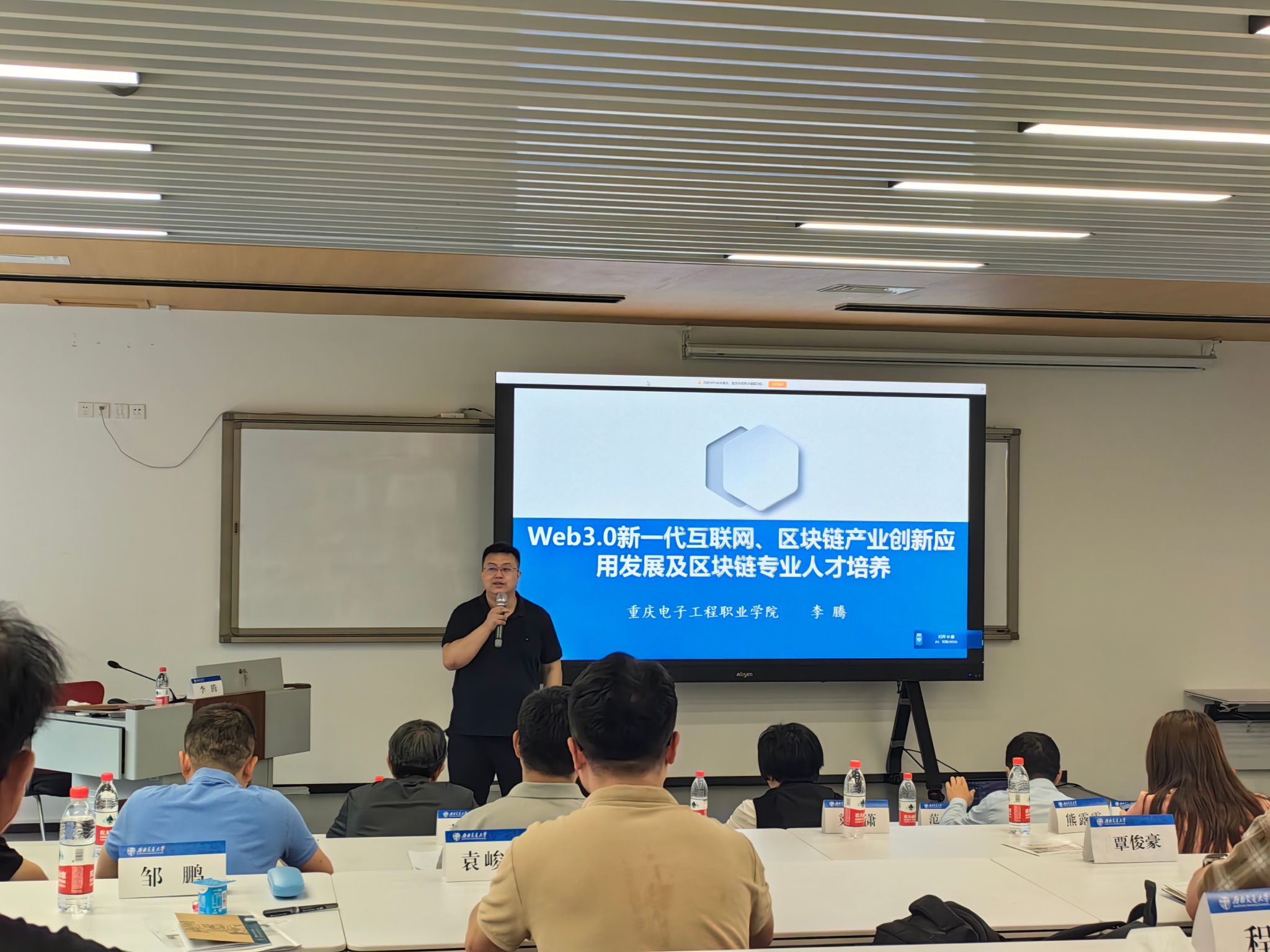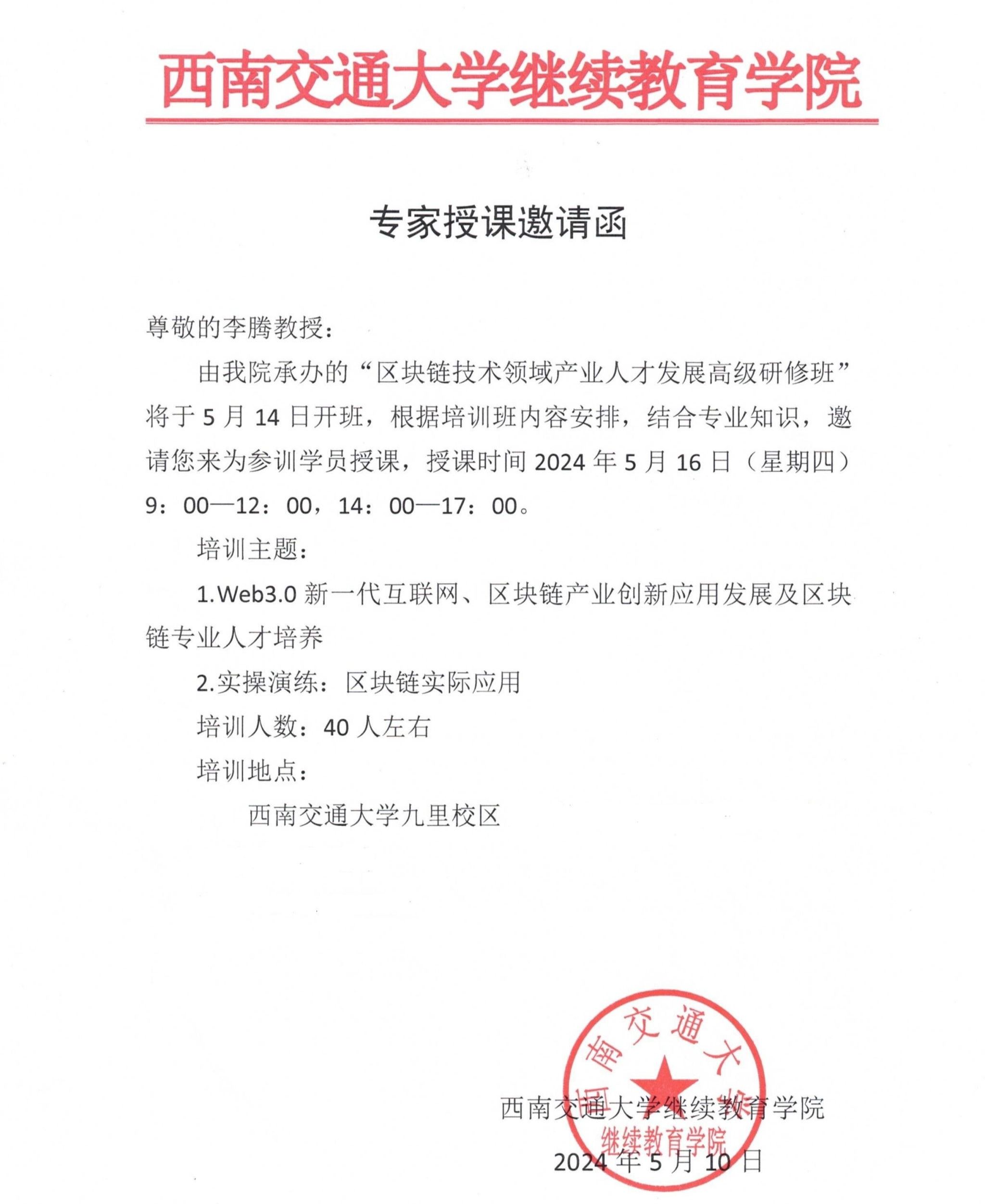 经人力资源和社会保障部批准、由四川省人力资源和社会保障厅主办、西南交通大学承办的“区块链技术领域产业人才发展高级研修班”在西南交通大学九里校区举行。5月16日,pg国际区块链技术应用专业带头人李腾教授受邀为研修班学员授课。
