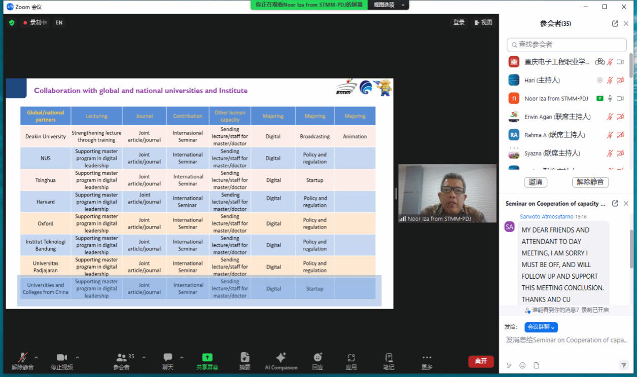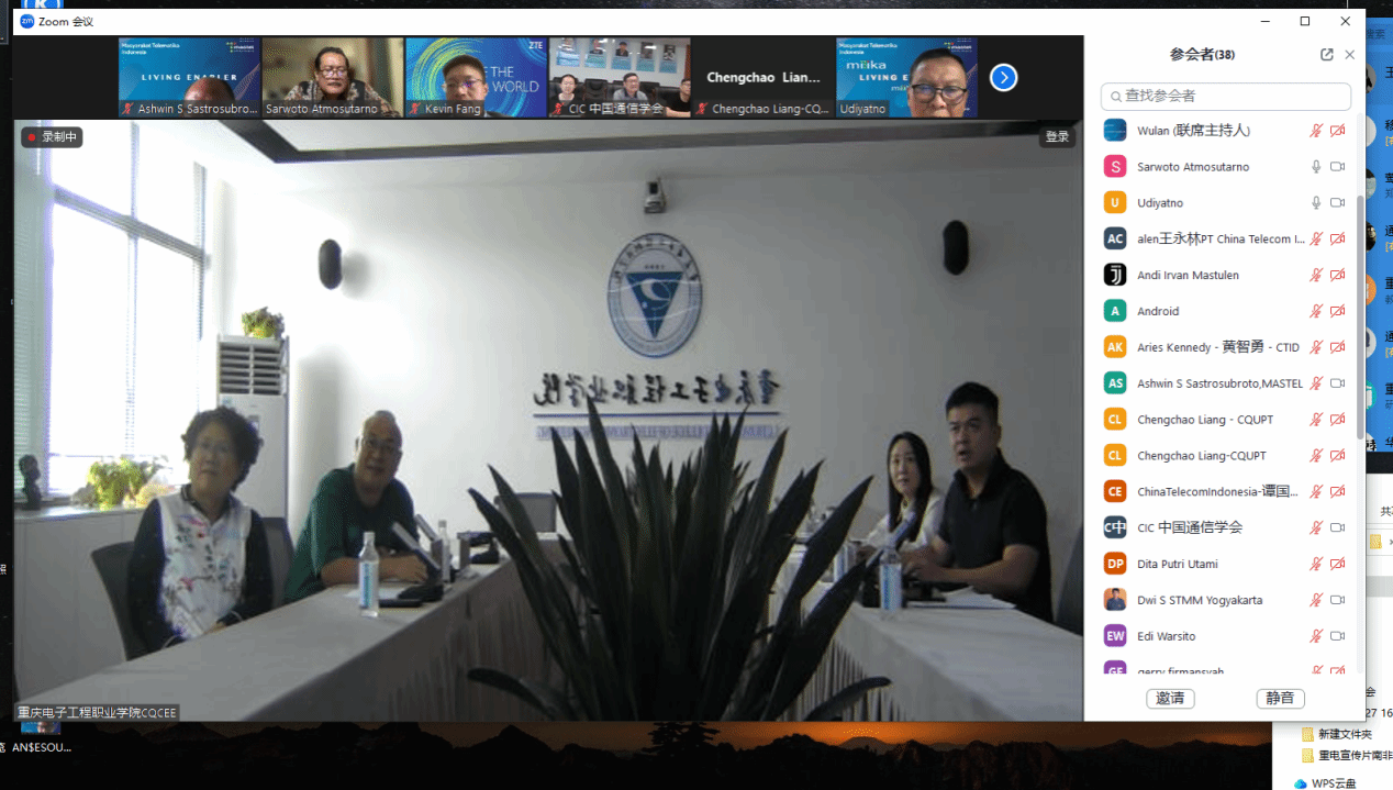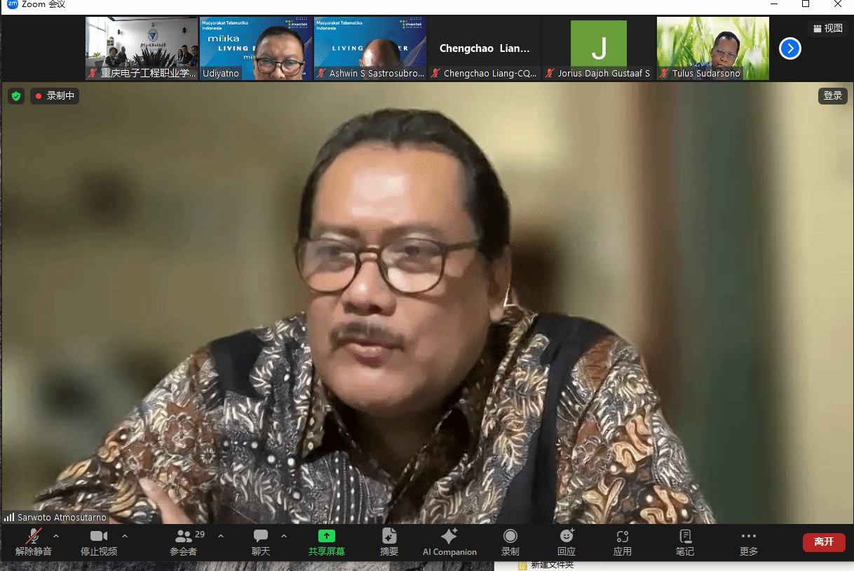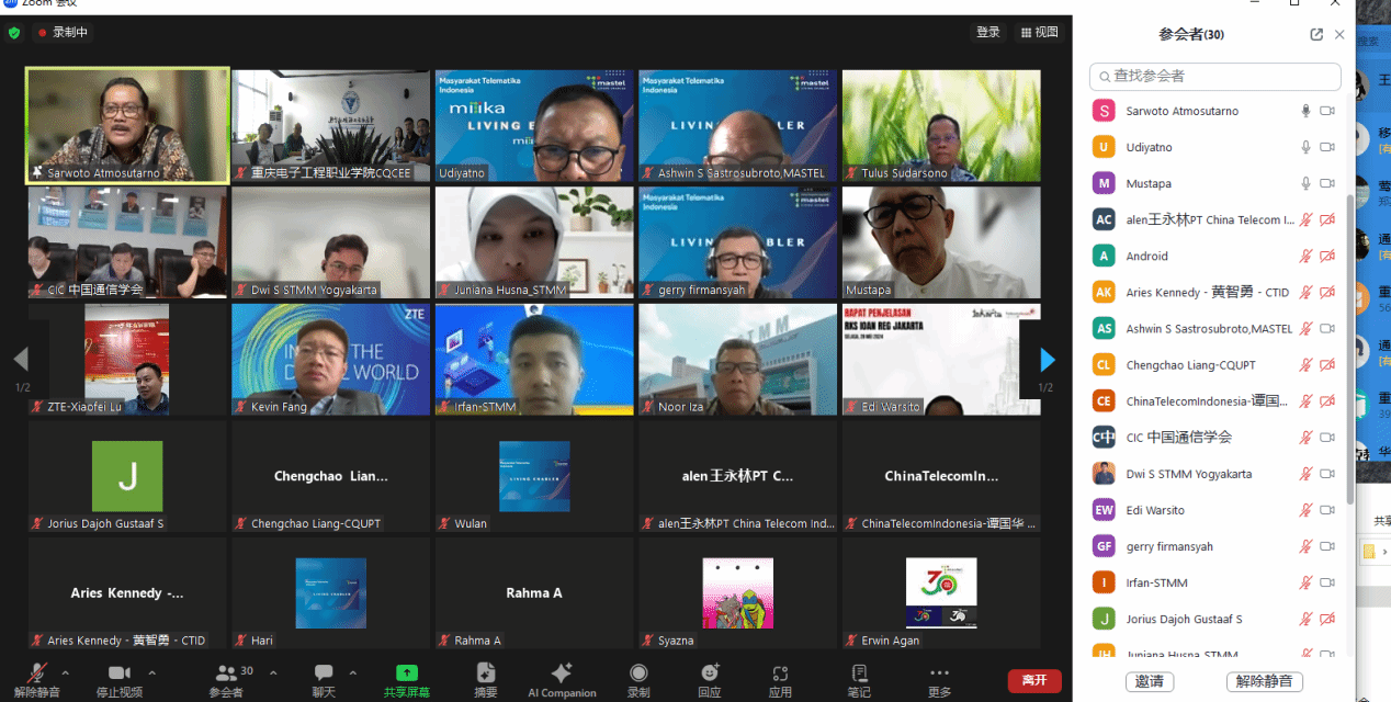 2024年6月5日下午,中国通信学会与印尼通信协会(MASTEL)通过“数智工场”平台,就云计算与信息通信领域的工程师能力建设和国际合作举行了线上研讨会。参与方包括重庆电子工程职业学院、印尼多媒体学院、重庆邮电大学、江苏电子信息职业学院以及中国电信、中兴通讯、艾优威科技等企业与学校。中国通信学会副秘书长欧阳武,印尼通信协会主席Sarwoto Atmosutarno、执行理事Tulus Sudarsono、数字文化发展与国家人才处主管Ashwin Sasongko Sastrosubroto,印尼多媒体学院主席Noor Iza、学术事务副院长Shinto Dwirawati,重庆邮电大学梁承超教授、江苏电子信息职业学院计算机与通信学院院长徐义晗,中国电信印尼公司总经理王永林、副总经理谭国华,中兴通讯印尼子公司教育行业总监芦晓飞、首席营销官方志伟,深圳市艾优威科技有限公司方案总监陈峰等应邀参会。pg国际副校长幸昆仑、国际交流与合作发展处处长刘宏宇、通信工程学院院长陶亚雄等负责人参加会议。