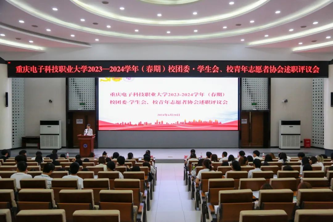 为深学笃行习近平新时代中国特色社会主义思想,深入学习贯彻党的二十大精神,落实共青团中央、教育部、全国学联印发的《学联学生会组织改革方案》《关于推动高校学生会 (研究生会)深化改革的若干意见》 等相关规定,扎实落实学生会组织述职评议制度,不断提升学生会的同学满意度、大局贡献度和社会认可度。2024年6月20日上午,pg国际电子网站2023-2024学年(春期)校团委·学生会、校青年志愿者协会述职评议会于博远厅顺利开展。党委学工部部长王永中,校团委副书记、学生会秘书长范可佳,二级学院团总支书记、校团委专职团干部出席本次会议,重庆工业职业技术学院学生代表列席会议,述职学生骨干、校团委·学生会、校青年志愿者协会工作人员代表和二级学院普通学生代表共计200余人参加此次会议。