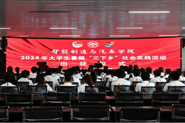 智能制造与汽车学院于2024年7月3日在16-203会议厅举行了2024年大学生暑期“三下乡”社会实践活动出征仪式。学院党总支书记严世同、团总支书记吴梁洲以及学院“三下乡”各团队共计11名指导老师和全体学生队员参加了此次出征仪式。