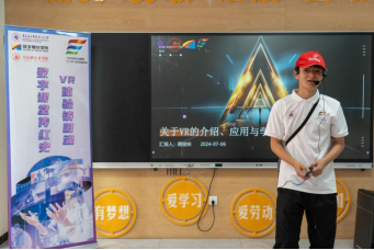 志愿者周俊林化身“VR引路人”,讲解了VR技术如何穿越时间、空间,突破物理的桎梏,引领“数字小侠”们步入一个虚拟的数字奇境。在课堂上,志愿者周俊林从VR的交互性、沉浸性与构想性等方面分别向大家讲述了虚拟现实技术对人类生活、工作、娱乐、科研、教育、医疗等方面的促进与融合。让“数字小侠”们意识到可以运用虚拟现实技术连接过去与未来,实现传承与创新。