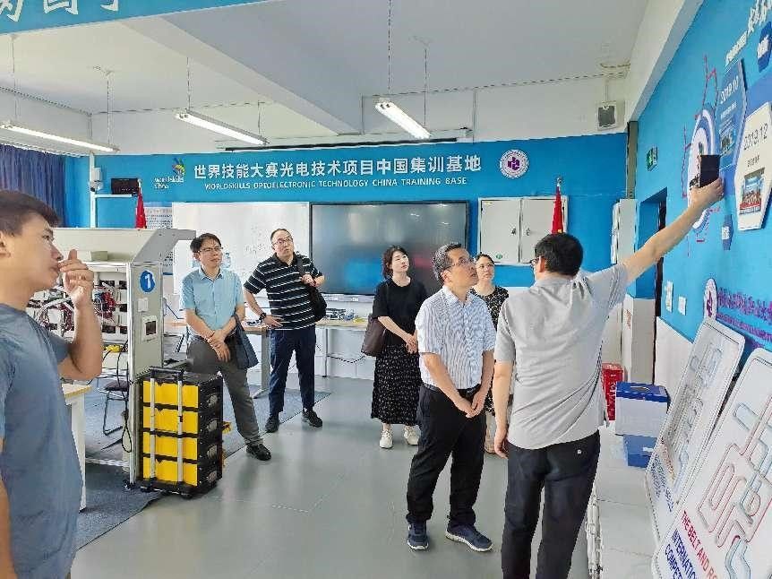 蔡建军一行首先参观了陈良国家级技能大师工作室、硅光子人才培养与技术创新中心、国家级集成电路专业群虚拟仿真实训基地、世界技能大赛光电技术项目集训基地,并与相关老师针对人才培养、技术研发与社会服务等进行了交流。