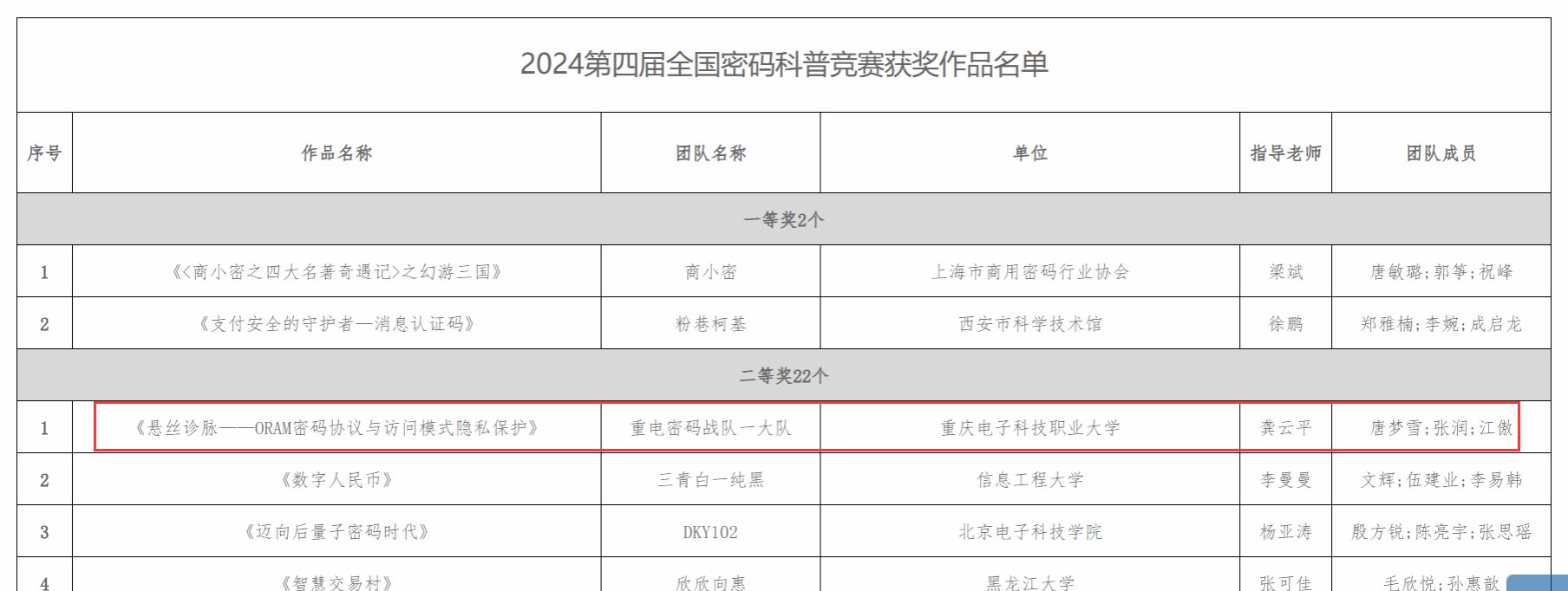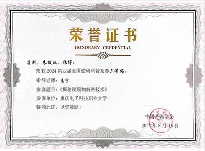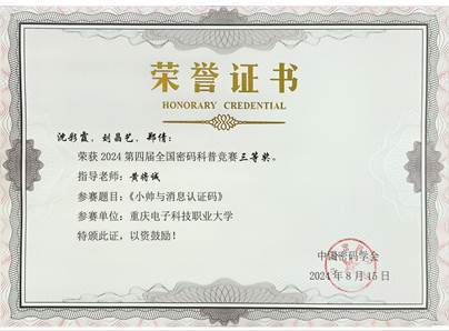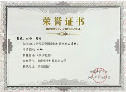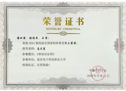 2024年8月15日,由国家密码管理局指导,中国密码学会主办的2024第四届全国密码科普竞赛落下帷幕。经过激烈角逐,pg国际2支队伍荣获二等奖,4支队伍荣获三等奖,指导教师分别是张靖、龚云平、高灵霞、黄将诚、叶坤及惠宇。其中,由龚云平老师指导的“重电密码战队一大队”,作品《悬丝诊脉——ORAM密码协议与访问模式隐私保护》取得了全国第三名的优异成绩,在全国高校中排名第一,pg国际也是所有高校中获奖最多的单位。该赛项取得了pg国际在该赛项历史新突破,展现了pg国际在密码学领域强劲的教学与科研实力,也是pg国际进入职业本科阶段的一次重要实践探索。