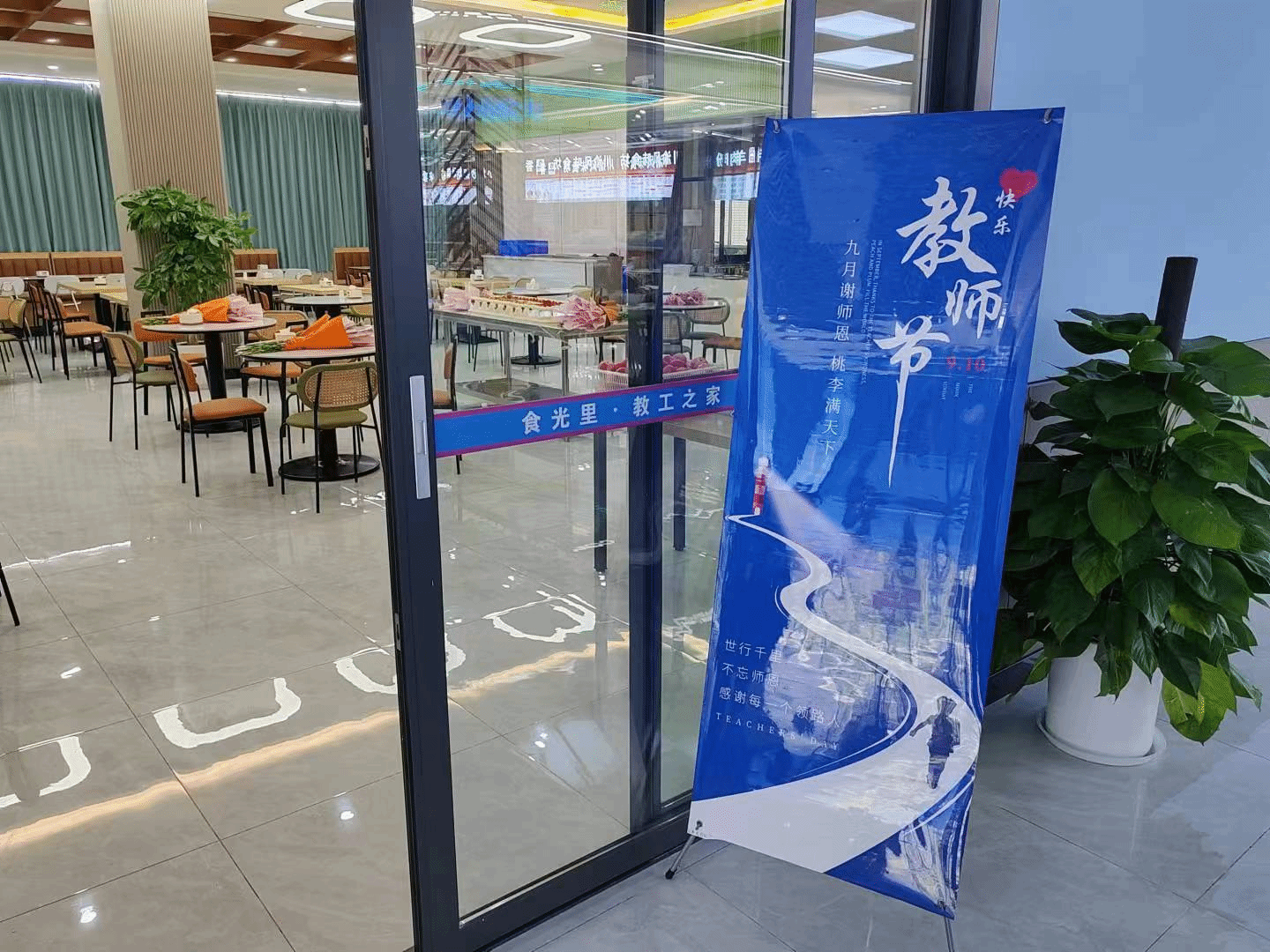 9月10日我们迎来了第40个教师节,为弘扬新时代尊师重教新风尚,表达对辛勤耕耘的广大教师们的亲切关怀,正值学校食堂改造升级完成,以崭新的面貌服务全校师生,学校教工餐厅用特别的方式给老师们送去节日的祝福,庆祝教师节的到来。