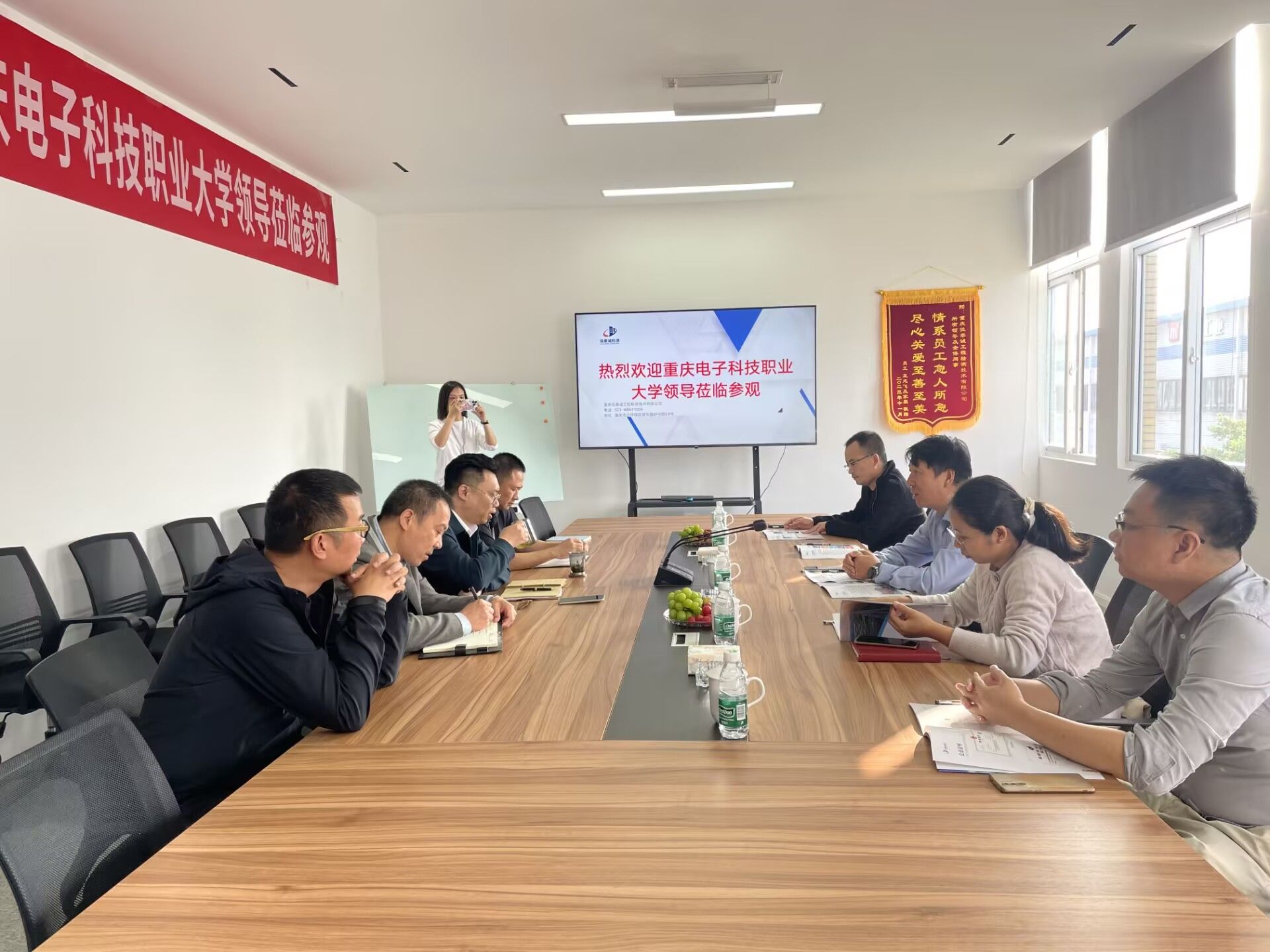 2024年10月14日上午,建筑与材料学院副院长边凌涛带队,学院智能建造技术专业主任秦文涛、学管科负责人陈镜宇、科研与社会服务科负责人周益嘉、专业骨干教师沈燕等一行,前往重庆佳泰诚工程检测技术有限公司考察交流,访企拓岗。