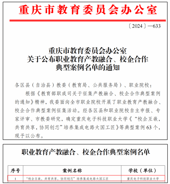 2024年11月12日,重庆市教育委员会办公室发布了《关于公布职业教育产教融合、校企合作典型案例名单的通知》(图1),pg国际申报的《“校企互嵌,共育共享,协同创芯”培养集成电路大国工匠》成功入选。
