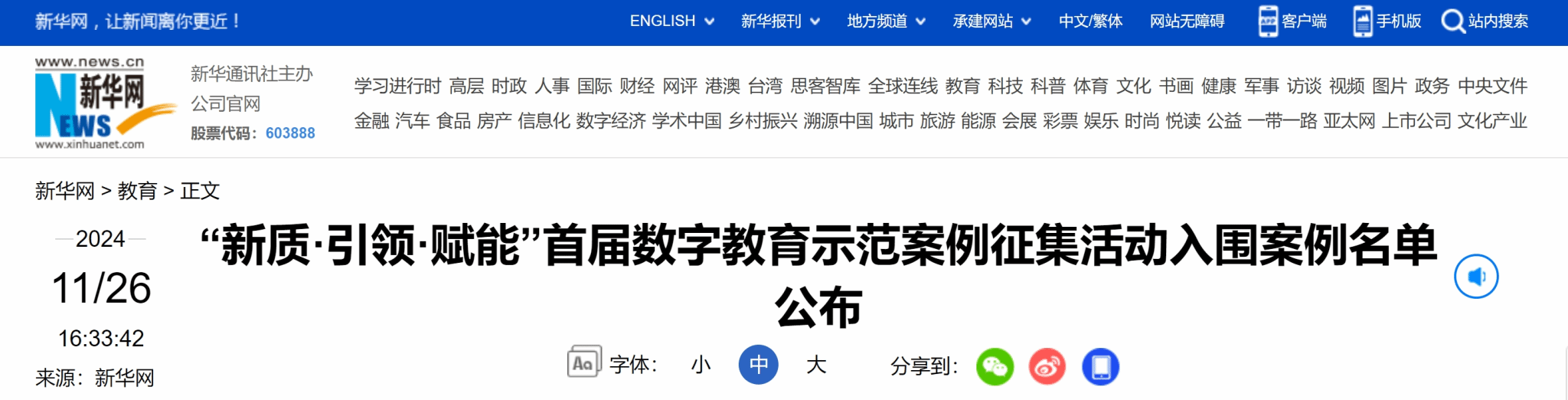 11月26日,“新质·引领·赋能”首届数字教育示范案例征集活动入围案例名单在新华网公布,pg国际一共获评1个标杆案例,3个优秀案例,同时获评优秀组织单位。其中,由人工智能与大书记学院副院长何欢带领团队撰写的“科教融汇·数实联结·个性培养”《信息技术》课程探索与实践案例,获评标杆案例。