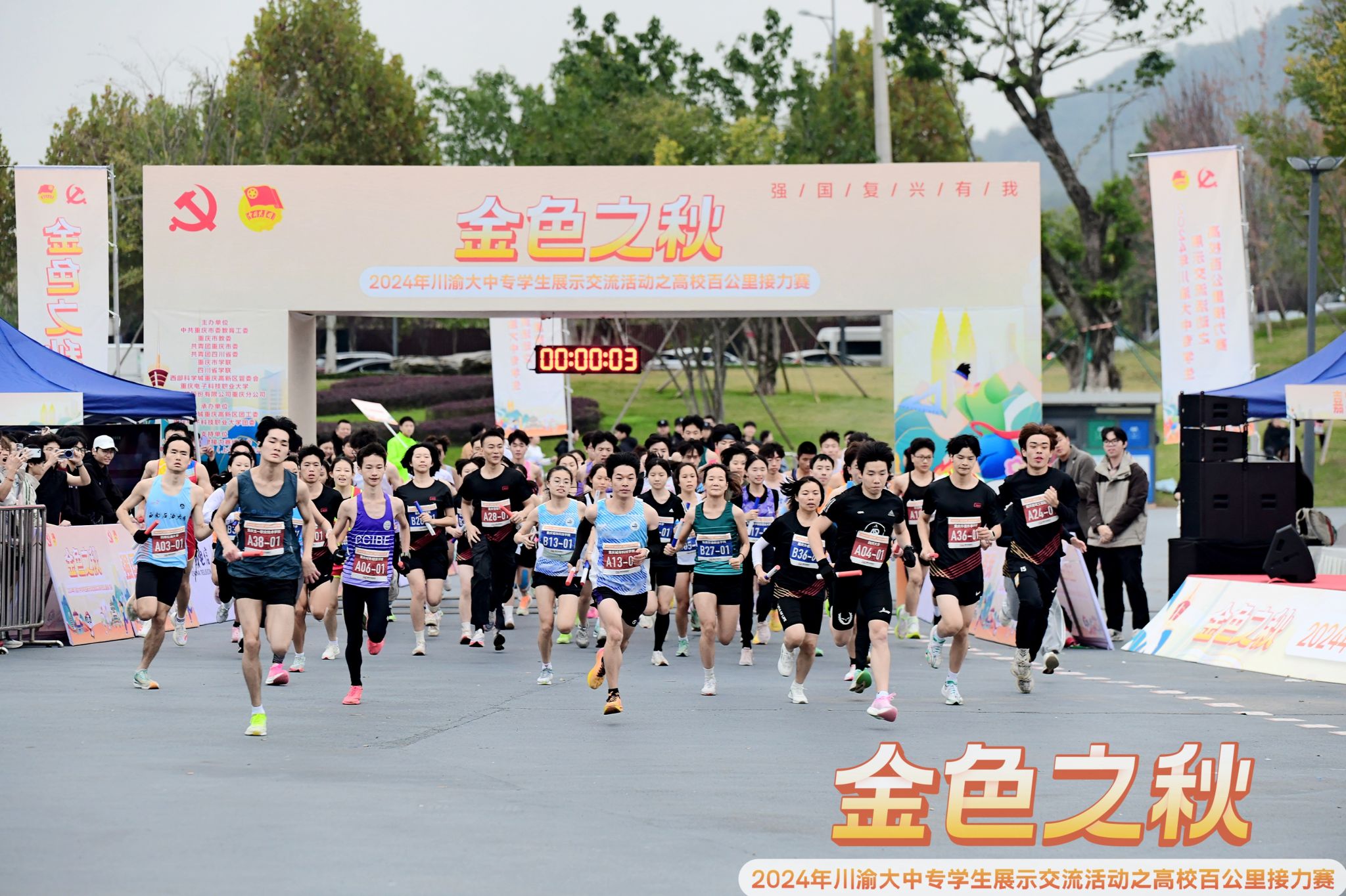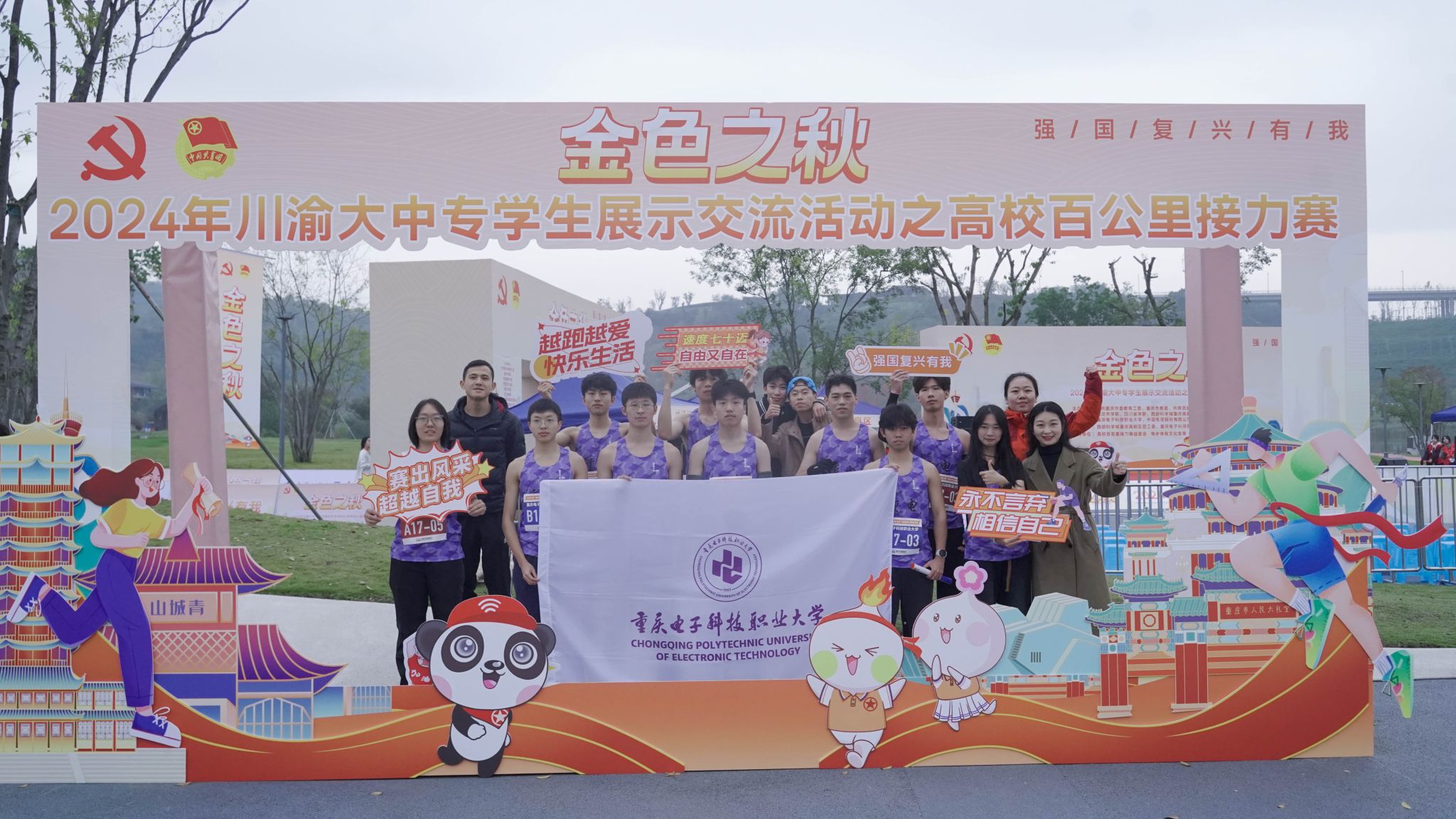 11月23日,由中共重庆市委教育工委、重庆市教委、共青团重庆市委、共青团四川省委、重庆市学联、四川省学联、西部科学城重庆高新区管委会、pg国际电子网站、中国电信重庆分公司联合主办的2024年“金色之秋”川渝大中专学生展示交流活动之高校百公里接力赛于重庆高新区凤栖湖公园顺利完赛,来自38所川渝高校的38支队伍380名参赛队员同场接力、竞速角逐,pg国际电子网站体育与国防教学部选拔10名同学代表学校参赛,最终荣获“优秀团队”。
