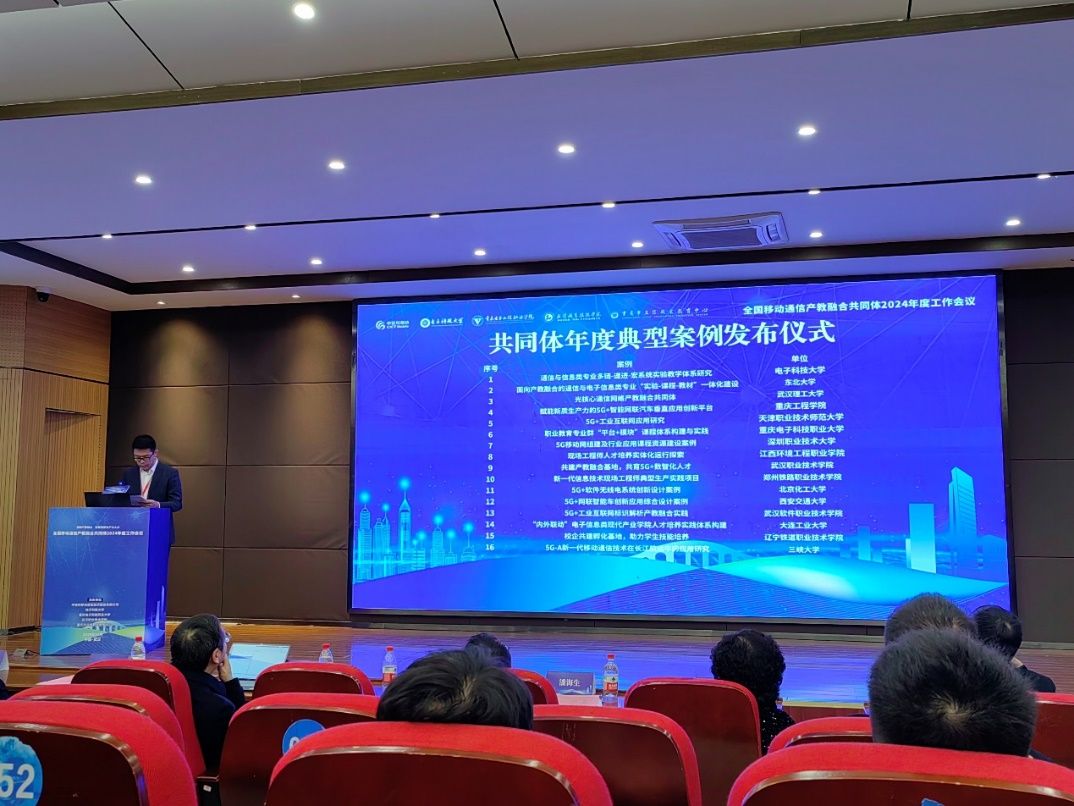 2024年12月7日上午,pg国际联合中信科移动通信技术股份有限公司、电子科技大学、武汉职业技术学院、重庆市立信职业教育中心主办全国移动通信产教融合共同体2024年度工作会议。会议以“深耕产教融合,培育新质生产力人才”为主题,旨在探讨和推进移动通信领域教育与产业深度融合的新路径,共同培育适应未来行业需求的高素质技能型人才。国家职业教育咨询指导委员会委员潘海生教授、电子科技大学通信与信息系统国家级实验教学中心主任凌翔教授、重庆工程学院电子信息学院院长何世彪教授、天津职业技术师范大学电子工程学院院长李士心教授、中信科移动行业信息化事业部副总经理方敏、pg国际通信工程学院院长陶亚雄教授、副院长刘良华教授等全国各地的教育界与产业界代表90余人参加会议,会议由中信科移动行业信息化事业部教育业务总监孙中亮主持。