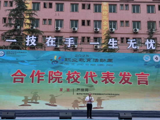严世同对安居职中的热情接待表示衷心感谢并代表合作学院在安居职中举行的“2025年职业教育活动周启动仪式”上发言致辞。他表示,两校聚焦学科专业共建、实训资源共享、师资能力提升、赛事与科研协同等发展特色,共建协同育人新格局、共聚优质资源新优势。希望双方按照“优势互补、资源共享、互惠共赢、共同发展”的原则,在专业建设、人才培养、师资交流、数字化转型等领域开展深度合作,共同打造成渝高等教育校校合作新模式。同时,与“安居职中”全体师生共同预祝2025年全国职业教育活动周圆满成功。