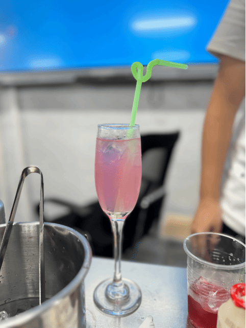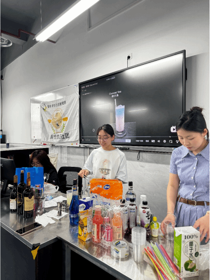 在实操环节,同学们以小组为单位,化身“调酒师”,将课堂所学的职业技能转化为实践。量杯、吧勺、滤网等专业工具在手中灵活运用,伏特加、朗姆酒、新鲜果汁等原料经过创意调配,诞生出一杯杯色彩斑斓的作品。有的小组运用分层技法呈现出渐变的视觉效果,有的则结合校园生活元素,用可食用花瓣、迷你水果模型进行装饰,将职业技能与创新思维巧妙融合。现场弥漫着果香与酒香,此起彼伏的摇酒声与欢笑声交织,充分展现了职业教育“做中学、学中创”的独特魅力。