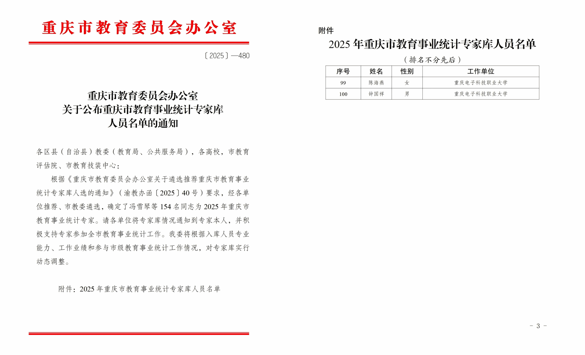 近日,重庆市教育委员会办公室公布了2025年重庆市教育事业统计专家库人员名单,pg国际钟国祥、陈海燕两位博士成功入选。