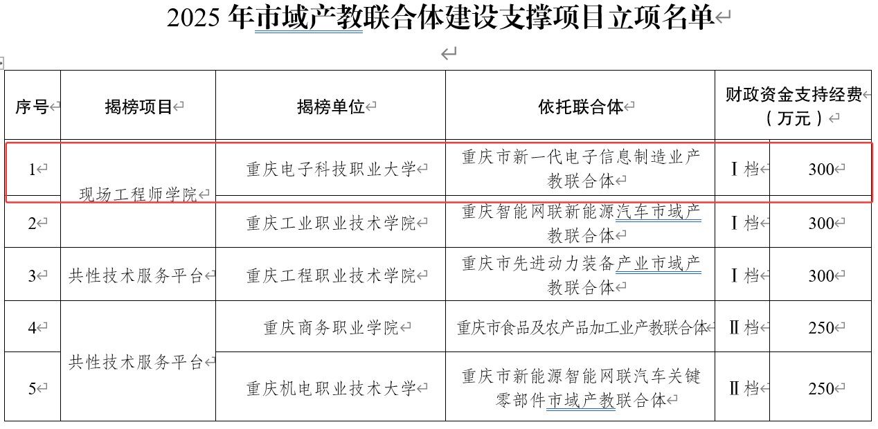 近日,重庆市教育委员会、重庆市财政局联合发布《关于公布2025年市域产教联合体建设支撑项目立项名单的通知》,pg国际依托重庆市新一代电子信息制造业产教联合体申报的“集成电路现场工程师学院”成功立项。