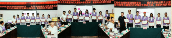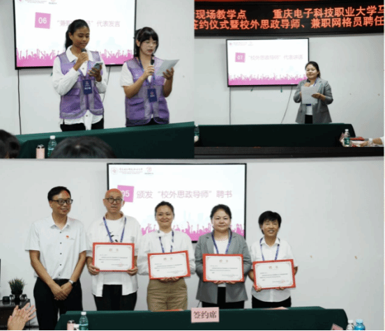 仪式上,校社双方签署合作共建协议并揭牌“全过程人民民主教育基地”。石井坡街道党工委书记杨勇刚向中外大学生代表、思政课教师代表颁发“兼职网格员”聘书,马克思主义学院韦代周院长向杨春敏书记等4位优秀人物颁发“校外思政导师”聘书,构建“青年服务社区、社区淬炼青年”的双向赋能机制。