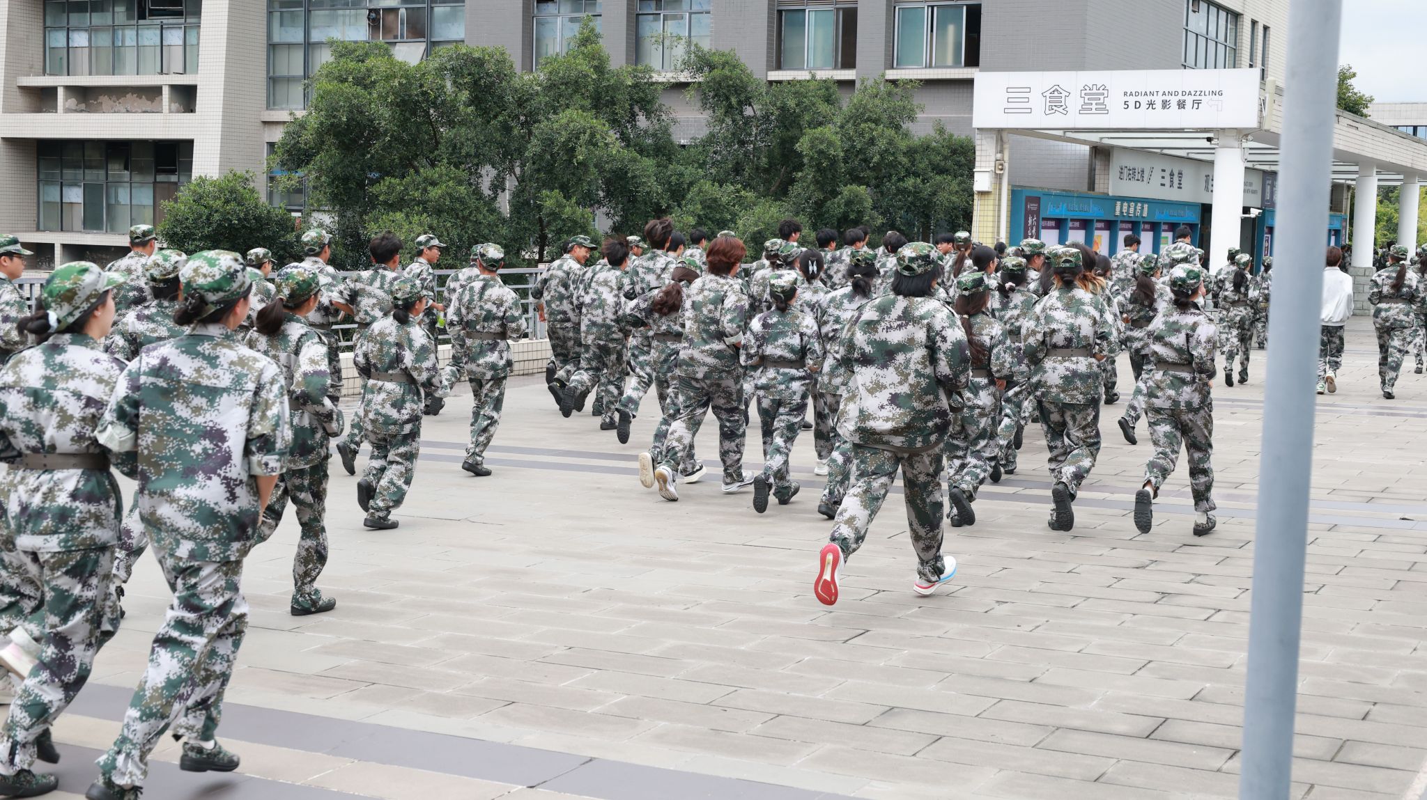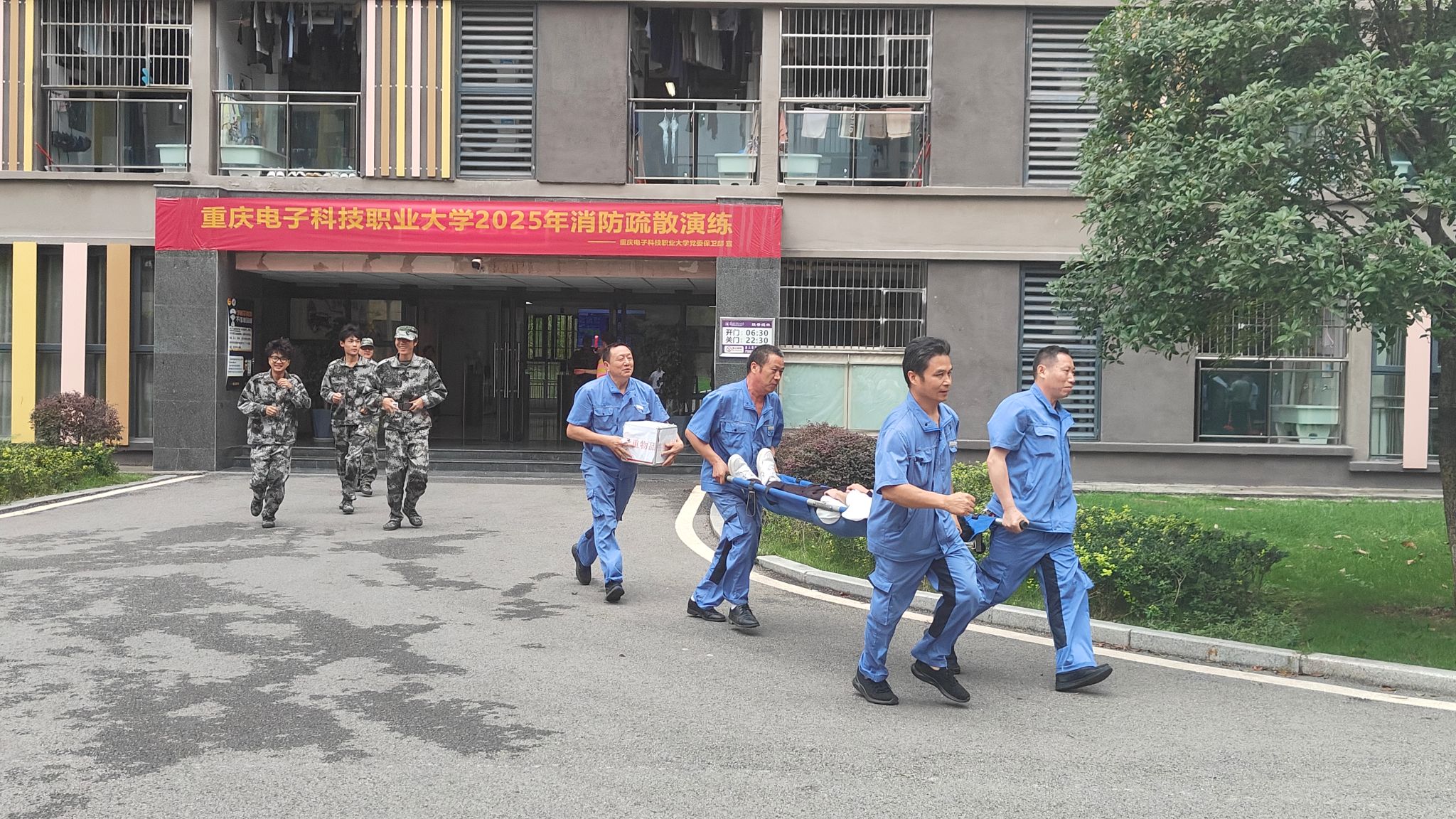 本次消防疏散逃生演练中,学生宿舍楼均安排军训教官和保卫干部在现场进行引导与监督,以防范突发事件发生。本次演练模拟学生公寓楼李苑4舍109房间内发生火灾,微型消防站接警后立即出动,短时间内完成对起火部位、火灾性质的确定,随着消防警报声响起,楼管人员迅速打开所有疏散通道,全体学生依据楼内逃生标识及工作人员指引,迅速而有序地撤离至安全区域。