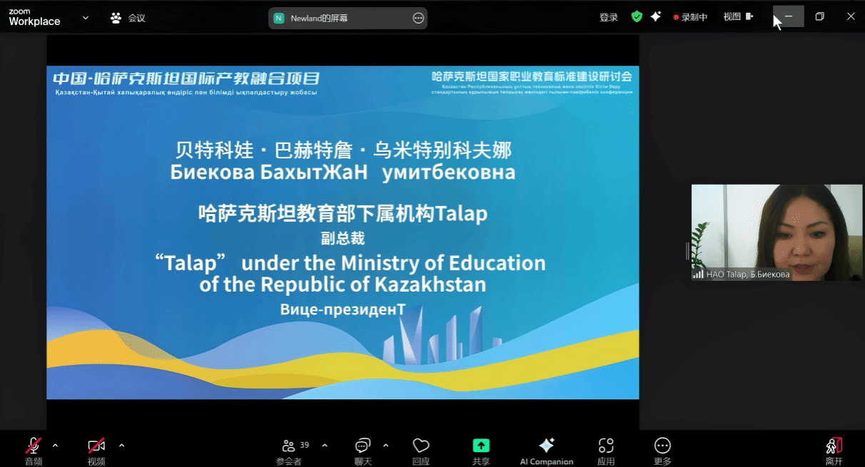 接下来哈萨克斯坦共和国教育部下属机构Talap副总裁巴赫特詹女士发言,她指出哈方积极推进职业教育现代化改革,重点聚焦信息技术、人工智能、建筑和无人机等新兴领域,希望通过与中方合作,引入先进的职业教育理念和标准体系,提升人才培养质量。