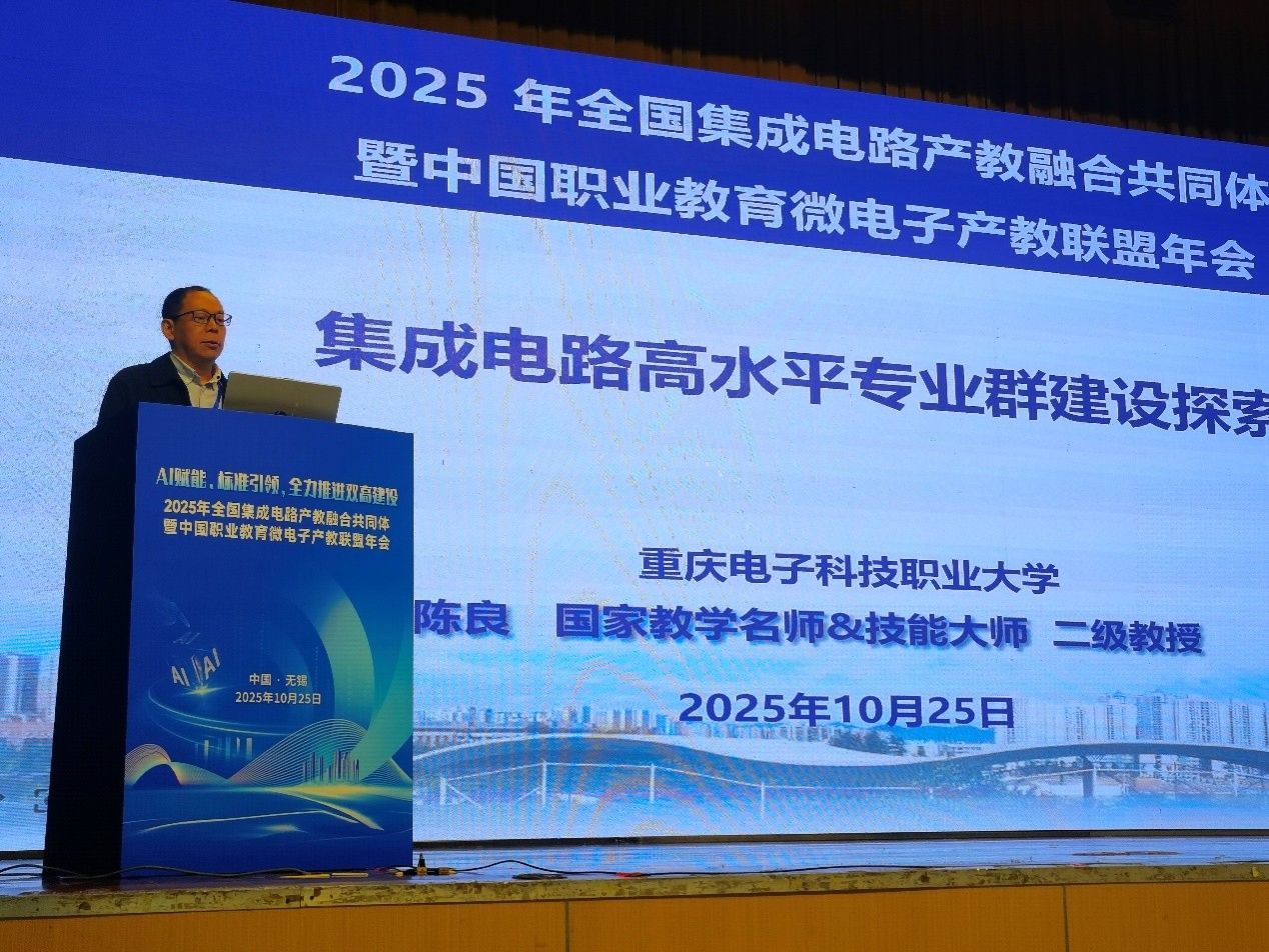 2025年10月25日,pg国际电子网站电子与物联网学院(集成电路学院)党总支书记陈良(二级)教授受邀出席在江苏无锡举办的2025年全国集成电路产教融合共同体工作会议暨中国职业教育微电子产教联盟年会,集成电路系副主任林涛教授陪同参会。本次会议以“AI赋能、标准引领,全力推进双高建设”为主题,汇聚了全国30余家企业代表、50余所院校代表,共同探讨集成电路产教融合与高水平专业群建设路径。
