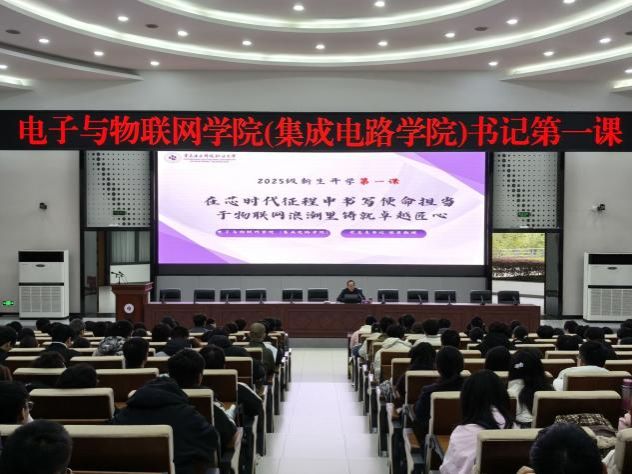 冬启新程绘蓝图,匠心筑梦向未来。为引导青年学子在时代发展浪潮中明晰成长方向、勇担青春使命,2025年12月8日,电子与物联网学院(集成电路学院)“书记第一课”在博远厅、智联楼A106先后开讲。本次课程以“在芯时代征程中书写使命担当,于物联网浪潮里铸就卓越匠心”为主题,为全体2025级新生带来一堂兼具思想深度、行业视野与人生温度的精彩课程。
