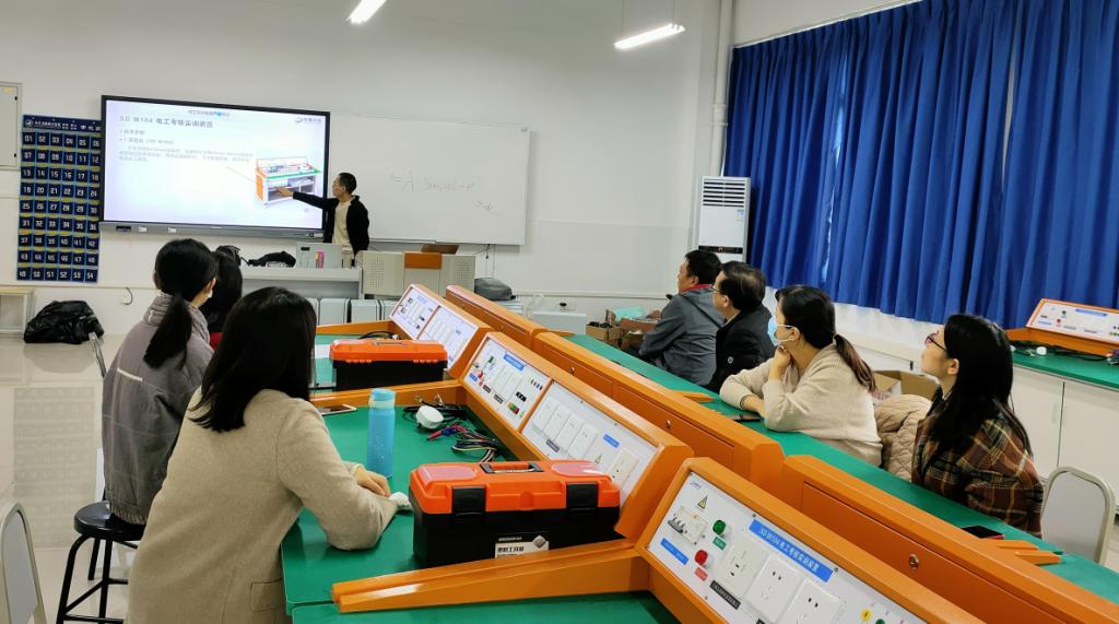 随后,沈工分别以“三相异步电动机的点动起动控制电路”和“家庭照明线路”为例,讲解了元器件的作用,演示了线路的连接,实现了电路的功能。最后,参培教师与沈工就学生使用装置的一些细节进行了交流和建议,对方表示接受建议并立即完善细节问题。