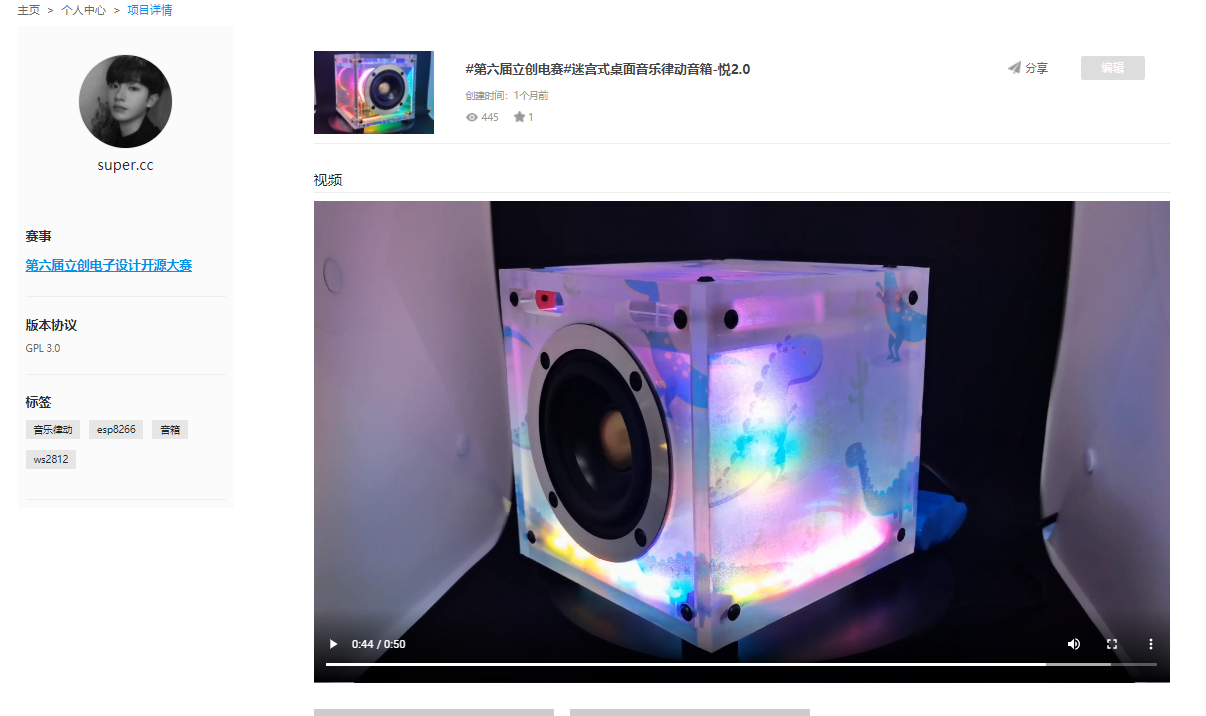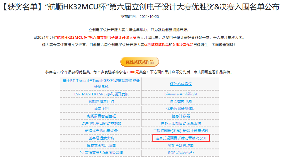 今年赛项自5月开启,选手经过近半年时间的创意、设计和制作,于10月提交作品进行评比。今年参赛选手有数千人,最终成功提交了作品1700余件,参赛选手涵盖各类高校师生、更有企业在职员工,竞争非常激烈,作品技术含量非常高。经过激烈角逐,最终评选了28件作品获奖,其中一二三等奖共8名,优胜奖20名。熊超同学的迷宫式桌面音乐律动音箱.悦2.0因为光电结合创意佳、音乐播放音效好喜获优胜奖。