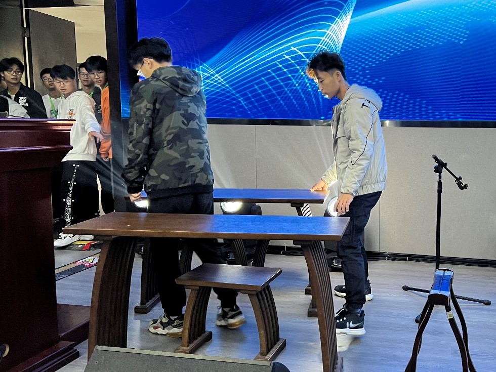 图3 i-World国际工坊成员陈嵩、谢铖山同学在会场组织布置表演道具
