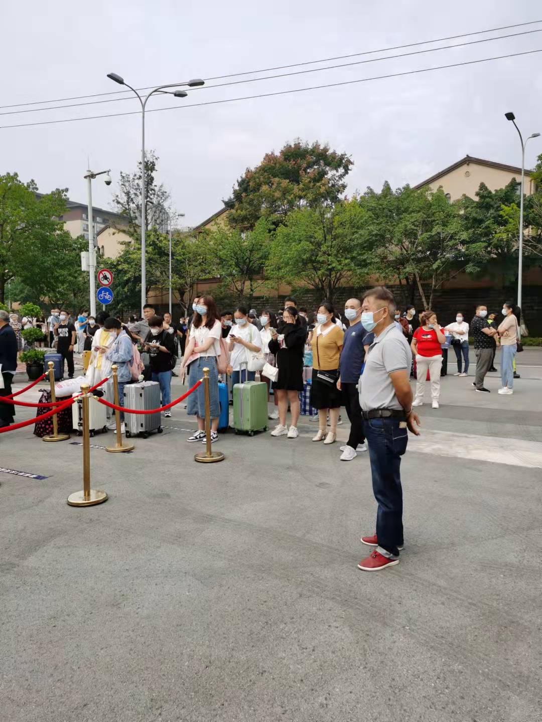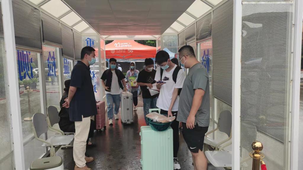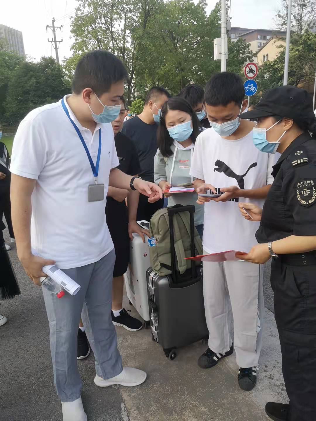 在疫情防控常态化的背景下,安全管理处提前制定详细安保工作方案,做好安保人员工作培训和安排部署。根据疫情防控需要,分时段报到,安全管理处提前与城管部门、交警部门报备沟通,确定新生报到人行路线及送行车辆临停点,备好防疫物资以应对突发情况。迎新期间,报到区域各执勤疏导点安保人员全部上岗,提示新生提前准备“一测一证一书三码”,做好迎新区域秩序维护,疏导劝离送行家长,引导协助新生前往报到点。