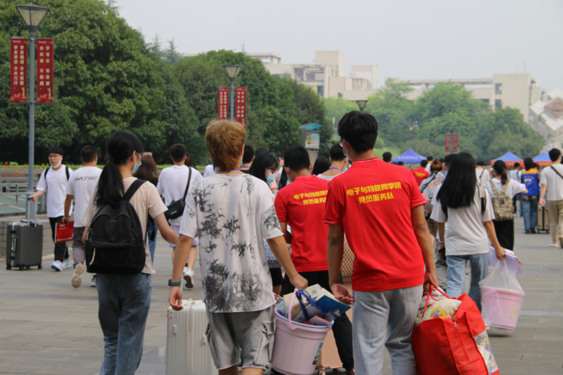 志愿者们在迎新工作中不辞辛劳,勇于奉献,全心全意为同学服务。他们用火热之心,以实际行动诠释着电子与物联网学院是一个温暖的大家庭。