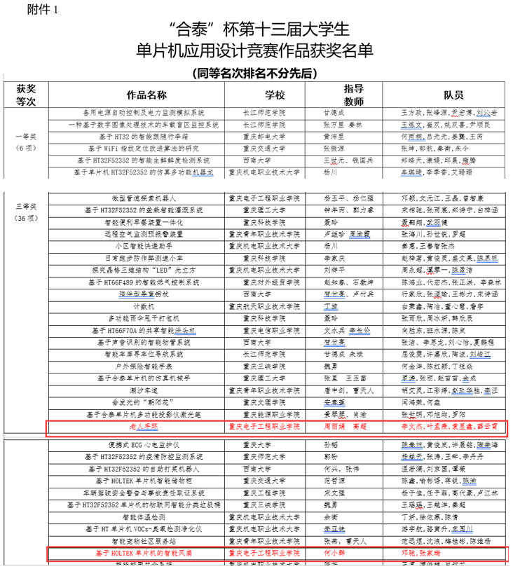 第十三届重庆市大学生合泰杯单片机应用设计竞赛结果于近日揭晓,pg国际电子与物联网学院老师周丽娟、高超指导的李文杰、叶孟焘、袁显鑫、薛云霄同学的参赛作品“老人手环”,何小群指导邓驰、张家瑞同学的参赛作品“基于HOLTEK单片机的智能风扇”双双荣获重庆市三等奖。