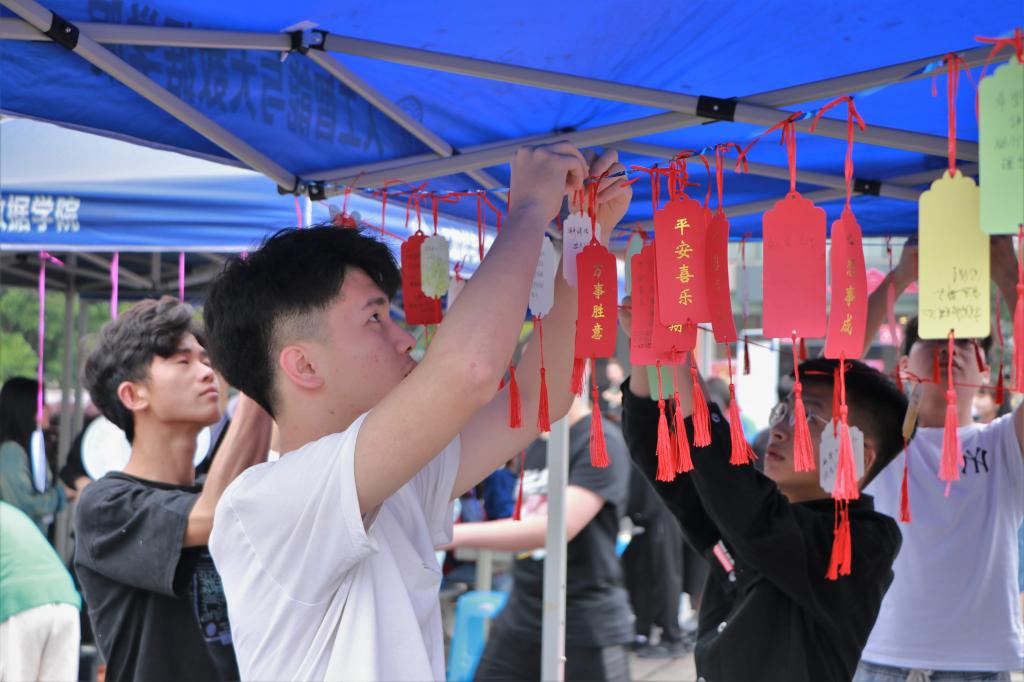 在“万能邮箱”活动的桌前,同学们都抢着领取许愿牌,将自己的美好愿望写在许愿牌上。同学们在许愿牌上留下了一行行有温度的文字,一笔一划皆是他们的期望,皆是他们对未来充满的向往。