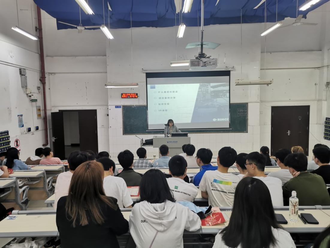 刘清菊老师对虚拟建造的概念、虚拟建造的应用点、以及虚拟建造技术在装配式、市政、房建、电力等实践项目中的应用进行介绍,并分享了目前市场上如何实现BIM虚拟建造,最后通过现场的VR设备让学生进行体验,互动学习。师生针对“虚拟建造在工程中的价值性、fuzor软件的自学”等问题和刘清菊老师进行了热切讨论。
