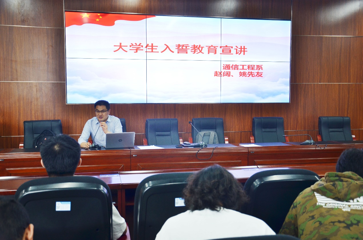蓝天见证雄鹰翱翔,大海见证鱼儿畅游,汗水见证勇士拼搏,鲜花见证我们成长。2021年5月24日,我院通信技术系主任赵阔老师和通信技术专业主任姚先友在我院14-307会议厅分别为现代移动通信、通信技术、轨道通信信号三个专业400余名学生进行了主题为“青春飞扬、入誓成长”的两场入誓教育活动。