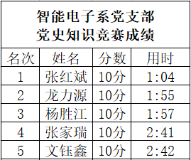 本次党史知识竞赛在电子物联网学院的全力支持下,智能电子系党支部的精心组织下,全体支部同志的积极参与下取得了圆满成功,为支部进一步深入开展党史学习起到了推动作用。