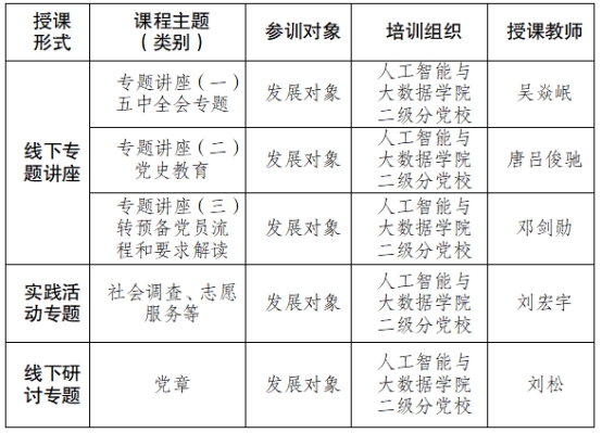2021年4月22-24日,人工智能与大数据学院在7-202、15-504教室举行2021年第2期发展对象党课培训。学院党总支书记吴焱岷、副书记刘宏宇、人工智能系党支部书记邓剑勋、学院专职组织员、督导员刘松、思想政治辅导员唐吕俊驰对发展对象从理论和实践的角度进行了培训。