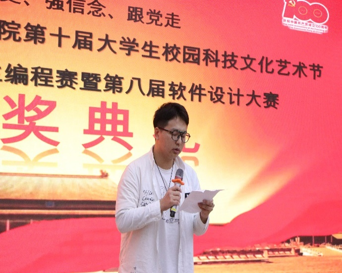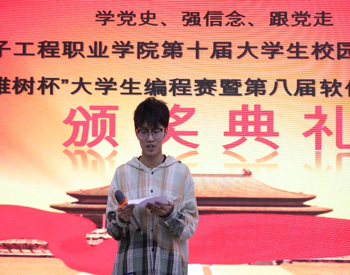 4月16日,重庆电子工程职业学院“学党史、强信念、跟党走”第十届大学生校园科技文化艺术节“稚树杯”大学生编程大赛暨软件设计大赛颁奖典礼在博润厅举行,学院党总支书记吴焱岷、学管科科长白锐、团总支负责人王菡、千贝软件社团指导老师朱堂勋出席并为获奖同学颁奖。