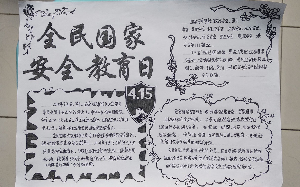 2021年4月15日是第6个全民国家安全教育日。为提高同学们对于全民国家安全法治意识和对新冠肺炎疫情防护的安全教育,对于践行总体国家安全观,统筹发展、传统安全和非传统安全,营造庆祝建党100周年良好氛围。通信工程学院党总支•党员流动服务站特开展本次“全国安全教育日”手抄报主题活动。