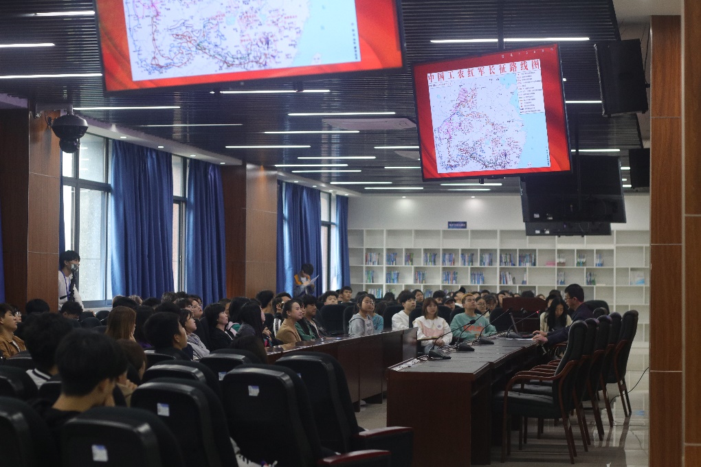 首先,何川老师以长征精神的内涵为切入点,重点阐述了长征的过程、长征的意义等方面内容。讲解中,何川老师介绍了众多长征过程中的感人事迹和真情实情,向同学们再现了这场伟大的万里跋涉的艰苦卓绝,让同学们感受到了先辈的不屈精神和坚定信念。