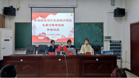2021年4月10日上午,智能制造与汽车学院分党校召开了发展对象党课培训班开训仪式,智能制造与汽车学院党总支书记罗永前、副书记丁伟、宣传委员王姗老师出席开班仪式。