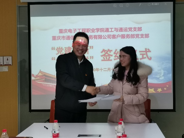 通信工程学院党总支书记曾晓宏与重庆市通信产业服务有限公司客户服务部党支部书记方运海分享了双方党建工作的经验何做法;双方人员就校企合作方面开展深入沟通交流,在人才培养、校企合作、科研合作等方面达成合作意向;重庆电子工程职业学院通工与通运党支部与重庆市通信产业服务有限公司客户服务部党支部签订了《党建翼联协议》并挂牌“校企共建党建创新实践活动基地”。