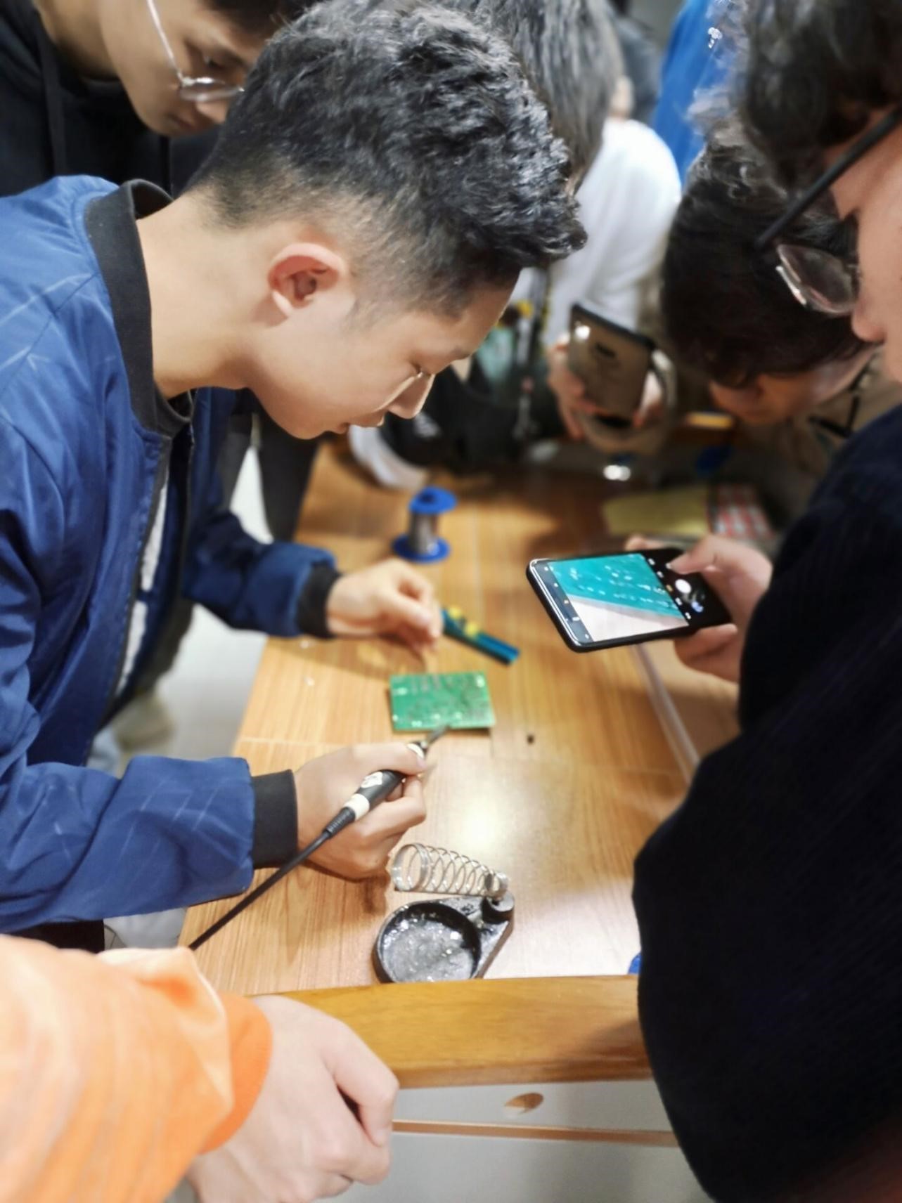 本次活动由智能电子产品设计工坊优秀学员王明元和龙朝光主讲。两位师兄为大一学生主要讲解了电子产品焊接技巧、焊接注意事项及焊接工艺标准。在现场学习环节,工坊学员悉心指导每位在场学生实际焊接操作,在实操练习中增进彼此互动,加深学习印象。
