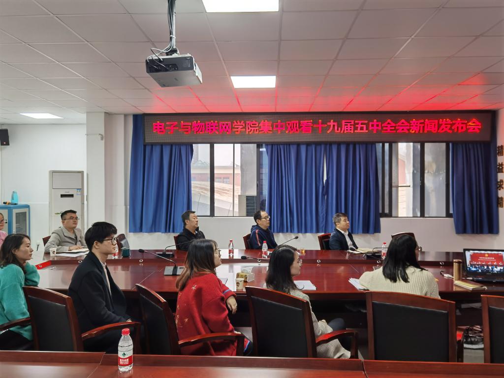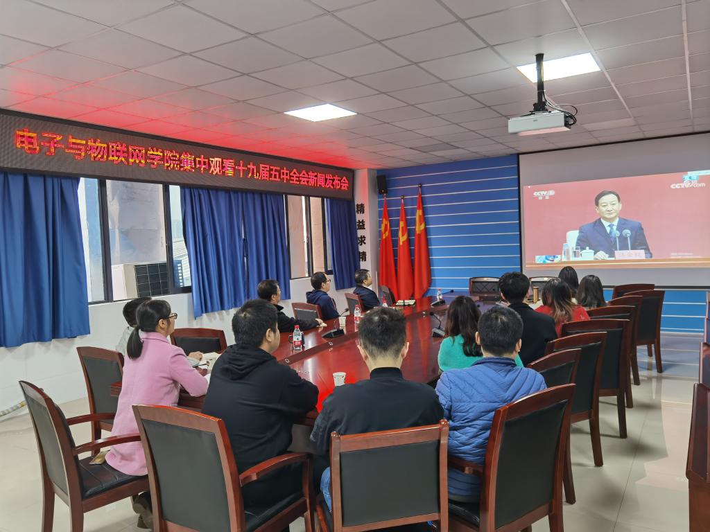 10月31日上午,电子与物联网学院党总支在12-507A会议室集中观看十九届五中全会新闻发布会,并认真学习了《中国共产党第十九届中央委员会第五次全体会议公报》和习近平总书记重要讲话精神。会议由党总支书记张红斌同志主持。