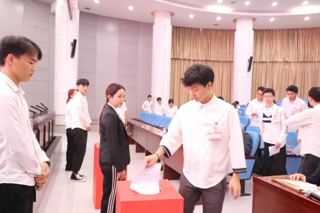 接着在大会总监票人的监督下,学生代表们投票选举了学院新一届学生会主席团成员,计票结束后,主持人公布了选举结果,会议选举产生三位新一届学生会主席团成员。名单公布后,党总支副书记刘宏宇讲话,他对新一届主席团成员寄予厚望,希望他们可以带领学生会以饱满的情绪,昂扬的斗志,本着为全院师生服务的宗旨,恪尽职守,为学院写下新的壮丽篇章。