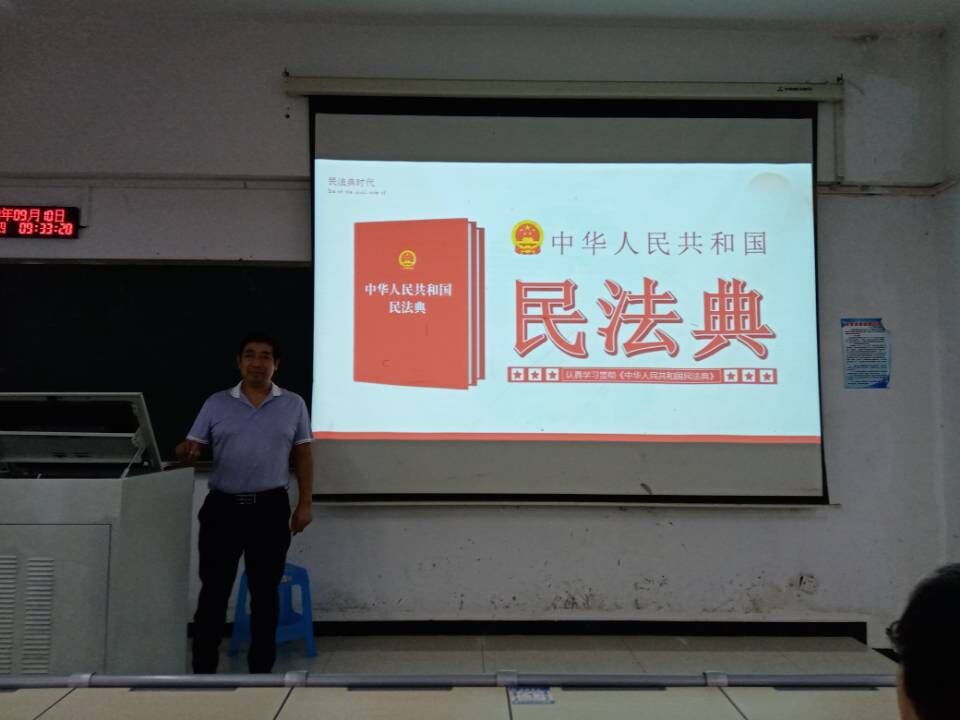 2020年9月10日上午,智能制造与汽车学院罗永前书记在10-212教室带领全体教师认真学习《中华人民共和国民法典》。 罗永前书记主要围绕“学好用好民法典 迎接法治新时代”这一主题,对《民法典》的制定背景、重大意义、主要内容和鲜明特色等进行了解读和阐释。特别指出:民法典的贯彻实施,是法治国家、法治政府、法治社会建设的重要内容。要求广大教师对《民法典》要深入学习领会;广泛宣传教育;坚决贯彻执行。为打造“智造重镇”、建设“智慧名城”、加快推动数字经济高质量发展提供坚强的法治保障。