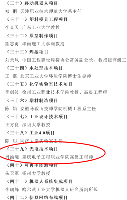 为做好中华人民共和国第一届职业技能大赛(以下简称“第一届全国技能大赛”)技术工作,近日,第一届全国技能大赛组委会秘书处公布了第一届全国技能大赛各项目裁判长名单,pg国际电子与物联网学院周渝曦老师当选光电技术项目裁判长。