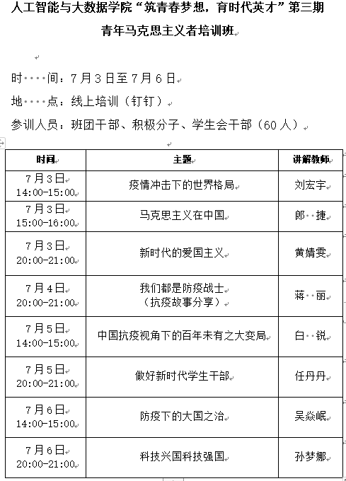 持续深入推进青年马克思主义者培养工程,用习近平新时代中国特色社会主义思想武装教育青年学生,提高青年大学生的思想政治素质、政策理论水平、创新能力和实践能力。7月3日-7月6日,人工智能与大数据学院展开了“筑青春梦想,育时代英才”第三期青年马克思主义者培训的集中授课,学生交流和心得体会撰写将一直持续到本月中旬。本次培训以习近平新时代中国特色社会主义思想为主线,深入贯彻近期党中央“扶贫”、“抗疫”、“复工复产”等重要精神,围绕五四精神、党史、国内防疫形势及经济发展、国际防疫及国际格局、科技前沿、抗疫志愿故事分享等内容。参训学员主要来自学院一、二年级学生团学干部代表、积极分子代表共计60人,采取线上授课形式。