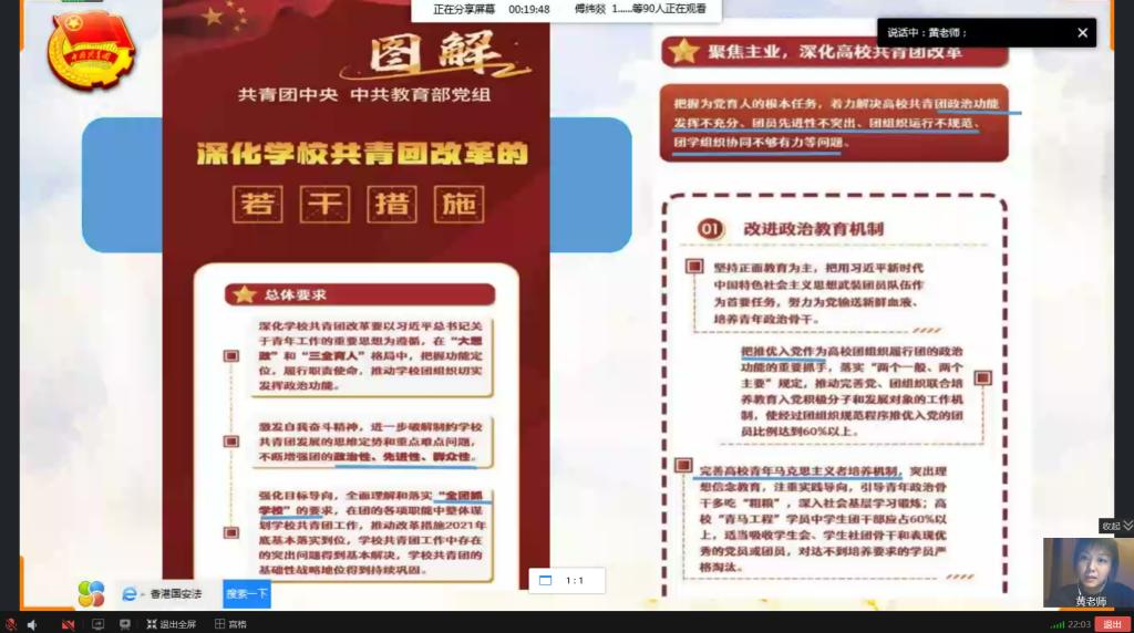 为贯彻落实高校共青团和学生会深化改革要求,切实加强和改进学院共青团各项工作和建设,也让学生会组织能更好的服务同学。7月9日晚,在新一期“稚树青春微团课”上,学院团总支负责人黄婧雯老师,蒋丽老师、任丹丹老师围绕进一步深化团学改革及对新时代团学干部的新要求等内容,给第二届团总支·学生会全体干部和第三届团学储备干部上了生动一课。