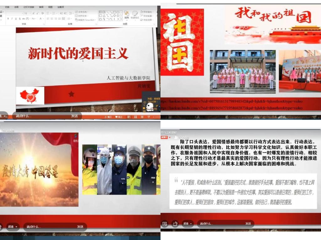 此次团课,黄老师围绕“五四精神”、“中国近代历史”、“疫情下的爱国精神”、“时事政治”等方面,通过小视频、图片、歌曲、动漫等多形式展示在不同历史阶段、不同时期爱国的正确表现,课程的内容既有意义,形式又生动有趣。黄老师指出新时代的爱国主义就是要树立高度的民族自尊、自信和自强精神,要把热爱中国共产党和社会主义与爱国高度统一,要勇于和善于同破坏国家统一、损害民族团结、危害社会主义事业的行为做斗争。